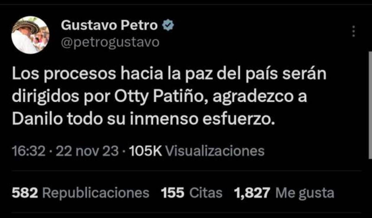 “Los procesos hacia la paz del país serán dirigidos por Otty Patiño, agradezco a Danilo todo su inmenso esfuerzo”, dijo Petro en un escueto mensaje publicado en la red social X (antes Twitter).