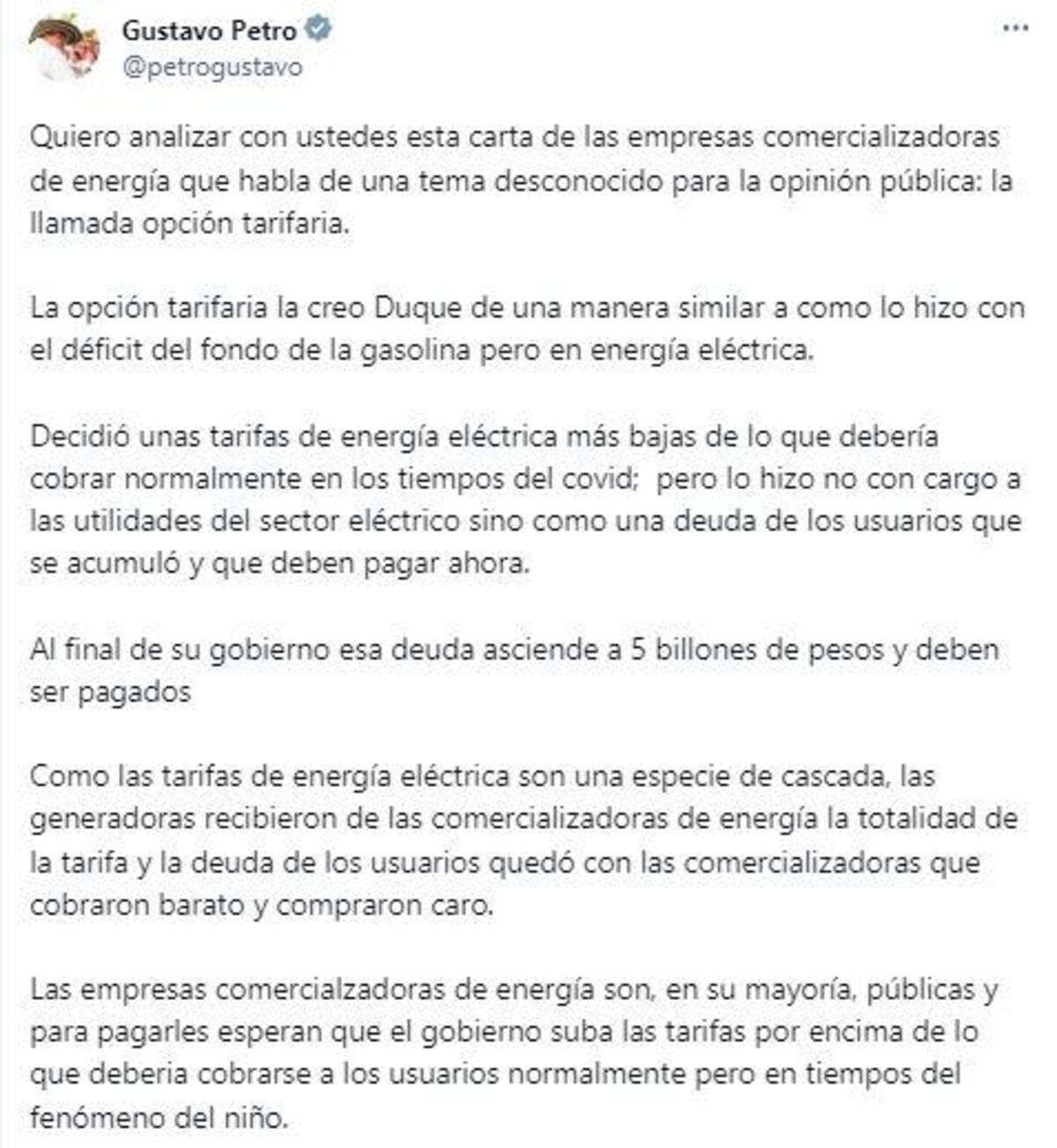 “La opción tarifaria la creo Duque de una manera similar a como lo hizo con el déficit del Fondo de la gasolina, pero en energía eléctrica. Decidió unas tarifas de energía eléctrica más bajas de lo que debería cobrar normalmente en los tiempos del covid; pero lo hizo no con cargo a las utilidades del sector eléctrico, sino como una deuda de los usuarios que se acumuló y que deben pagar ahora”, afirmó el presidente Petro.