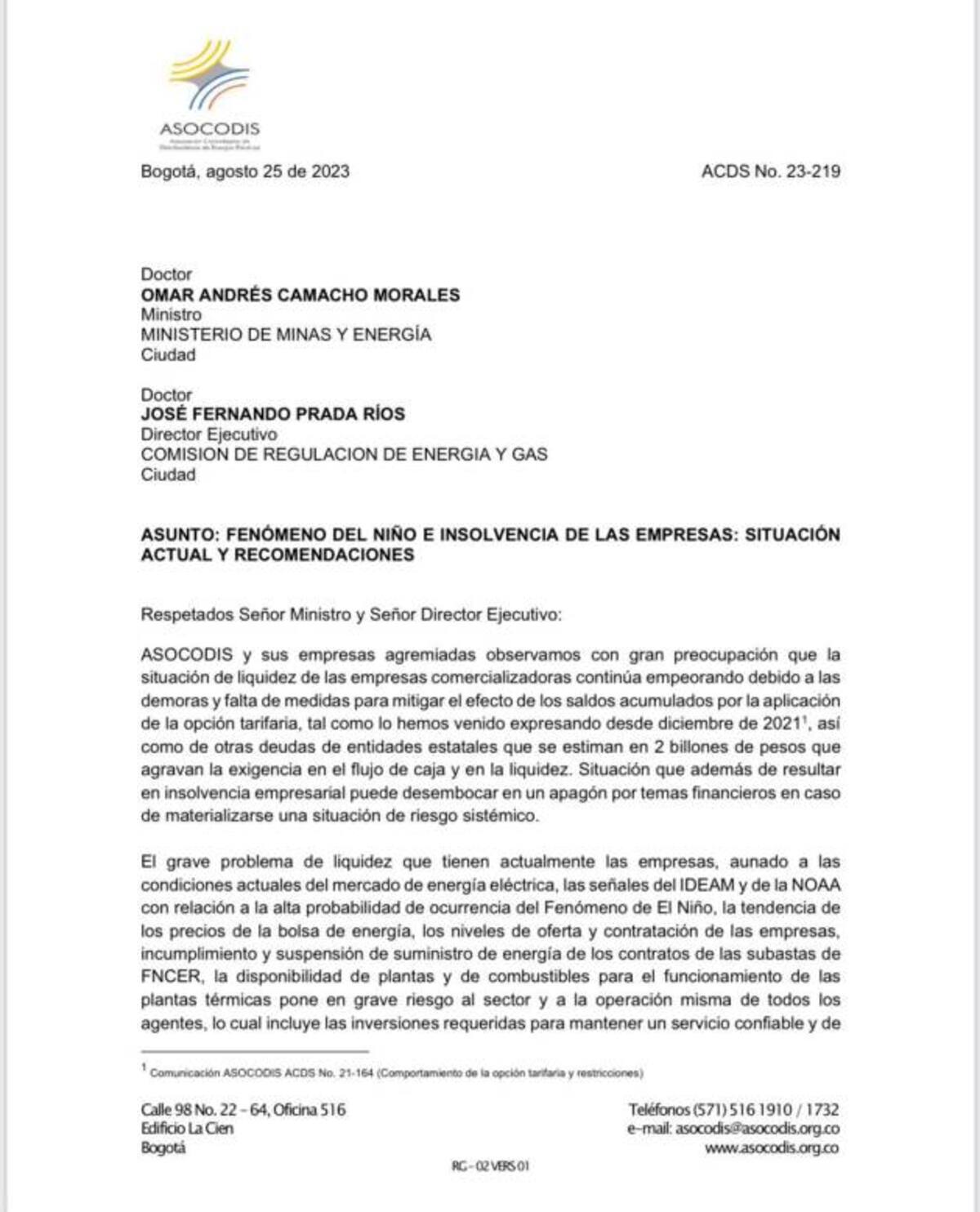 Sobre esta situación expuesta por Asocodis, el Ministro de Minas y Energía, Ómar Andrés Camacho, aseguró, durante un debate de control político en la comisión quinta del Senado, que el Gobierno habilitará un auxilio financiero para que las empresas puedan afrontar el periodo del Fenómeno del Niño.
