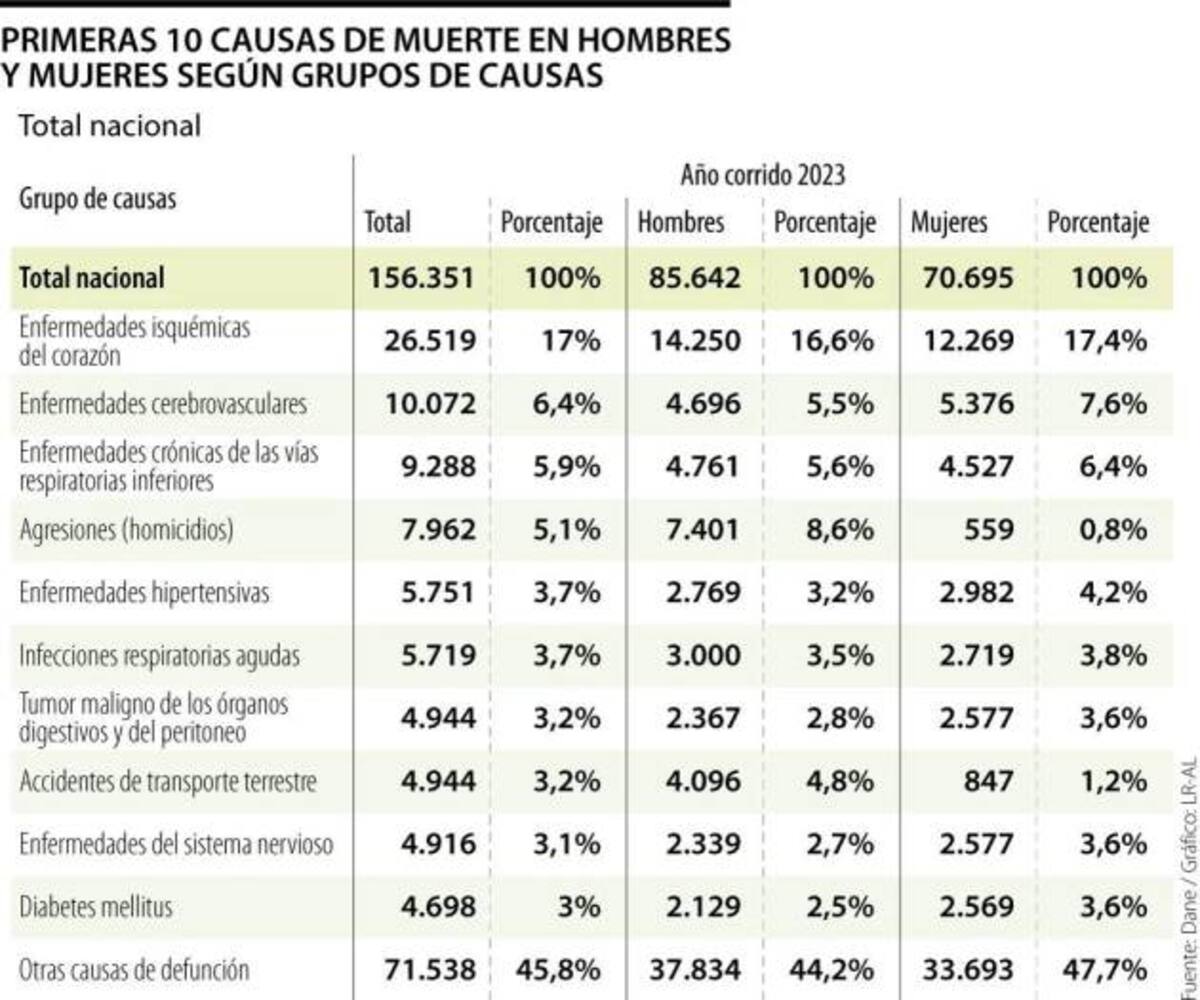 Respecto a las causas de muerte en lo corrido de año 2023, el Dane da cuenta que la primera tiene que ver con enfermedades isquémicas del corazón. En lo que va del año, este tipo de enfermedades han significado 26.519 muertes. Segregando por sexo, 16,6% de muertes en hombres tuvo que ver con enfermedades isquémicas del corazón, mientras que significó 17,4% para las mujeres.