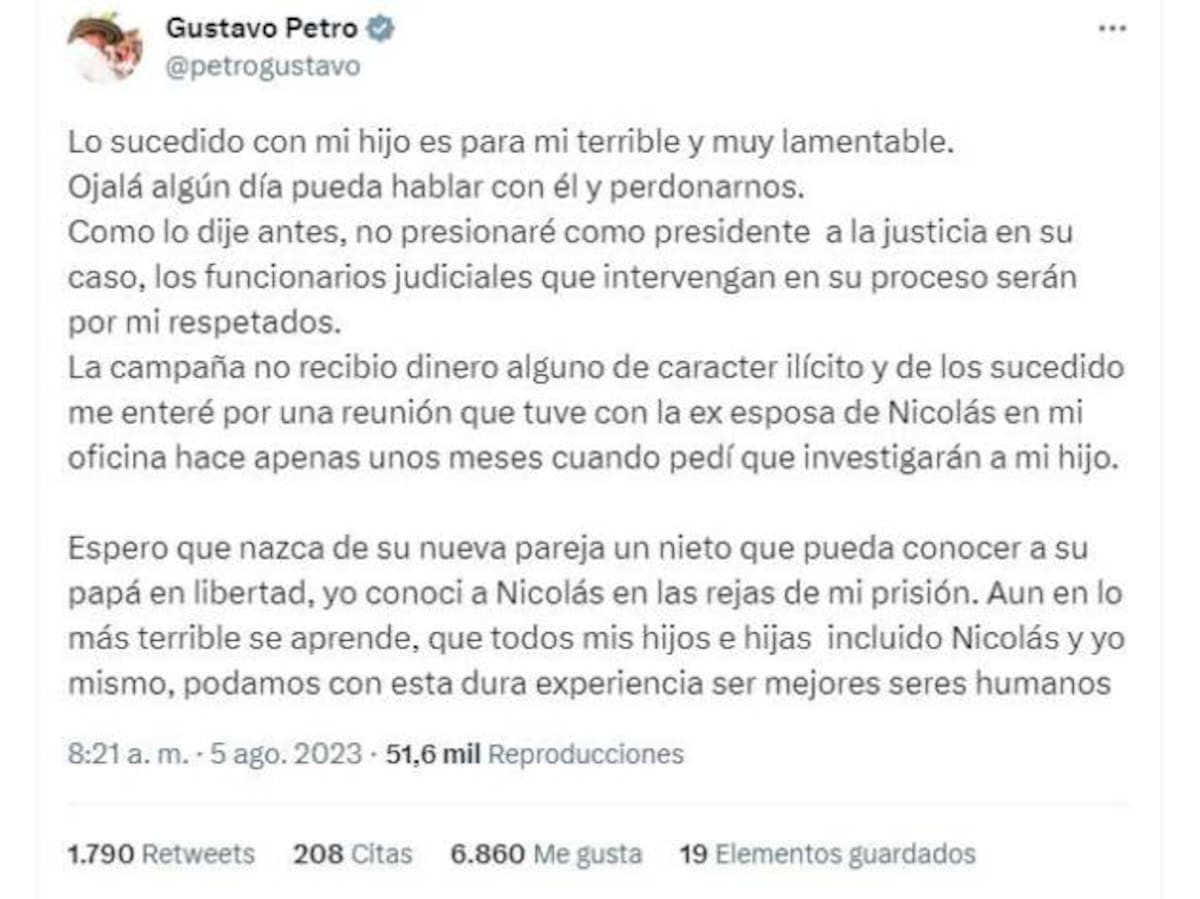 Luego de que la Revista Semana publicara una extensa entrevista con Nicolás Petro sobre el caso de entrada de dineros ilícitos a la campaña presidencial de Gustavo Petro, el presidente reaccionó en sus redes sociales y le envió un mensaje a su hijo.