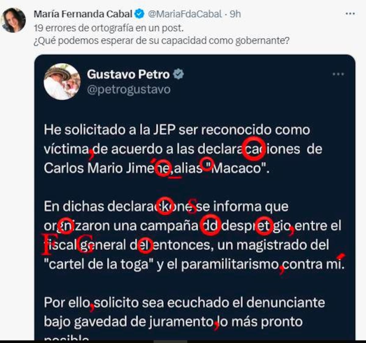 “19 errores de ortografía en un post. ¿Qué podemos esperar de su capacidad como gobernante?”, con esas palabras, la senadora María Fernanda Cabal no solo criticó la manera de escribir del presidente Gustavo Petro, sino que puso en duda sus capacidades para ser jefe de Estado. Lea aquí: Lo que dice la Mesa de diálogos sobre el supuesto atentado contra el fiscal