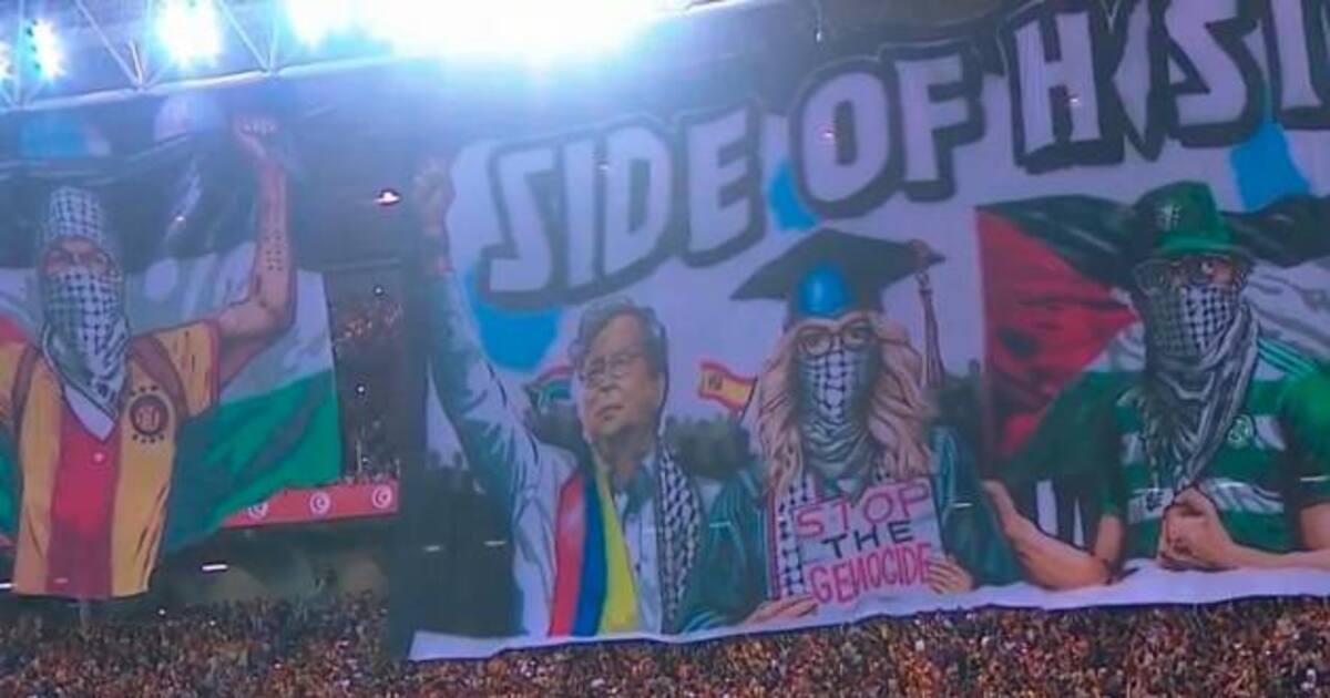Humanidad, fe, coraje y detener el genocidio se ven en las gigantes imágenes desplegadas por los hinchas. Igualmente, se ven víctimas y personas con banderas de Palestina, entre estos se ve al Presidente Gustavo Petro, quien ha sido férreo defensor de la causa Palestina y su lucha contra Israel en Gaza. Lea aquí: Petro contó lo que hacía el director de La Modelo que fue asesinado