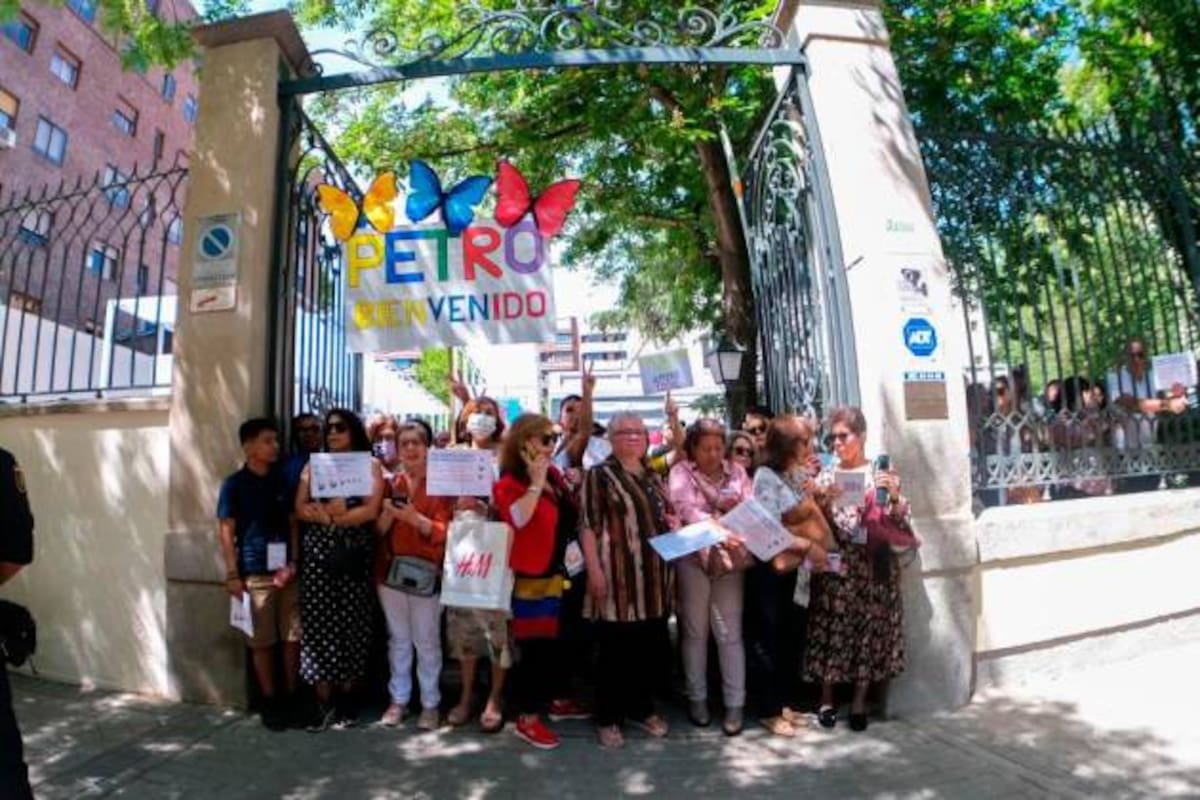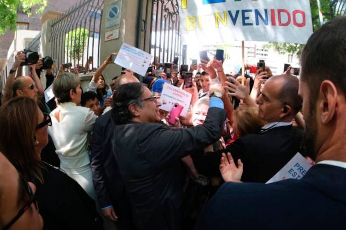 Con la voz desgastada por discurso del lunes en el llamado balconazo en la Casa se Nariño y con una veintena de Colombianos que le esperaban frente de la embajada de Colombia en Madrid, el presidente Gustavo Petro, inició su gira por este país que lo trae en visita de Estado. Lea aquí: La idea es sacarlo: Petro sobre el tesoro del Galeón San José