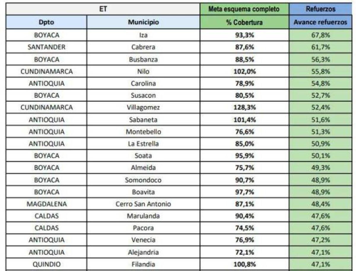 De acuerdo con el Ministerio de Salud, 525 municipios del país cumplen con el 70% de esquema completo, mientras que solo 78 con el 40% de dosis de refuerzo requerido para decirle adiós al tapabocas desde el 1 de mayo.
