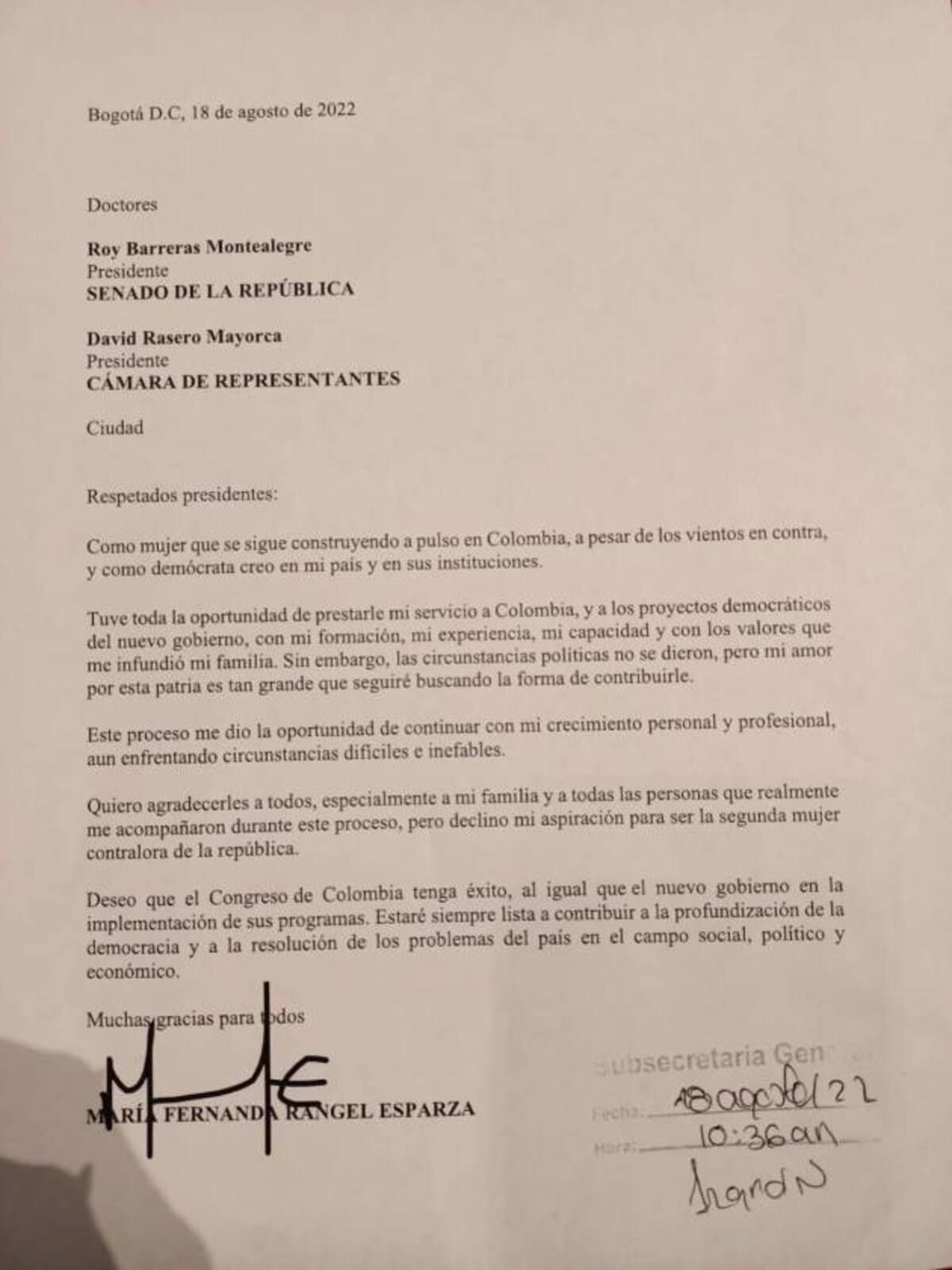“Tuve toda la oportunidad de prestarle mi servicio a Colombia, y a los proyectos democráticos del nuevo gobierno, con mi formación, mi experiencia, mi capacidad y con los valores que me infundió mi familia. Sin embargo, las circunstancias políticas no se dieron”, expresó Rangel en una carta dirigida al presidente del Senado, Roy Barreras, y al presidente de la Cámara de Representantes, David Racero.