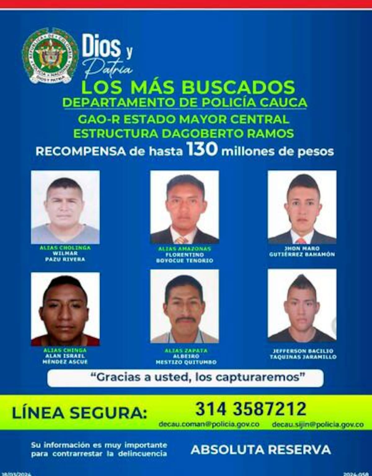 “Se ofrecen hasta $130 millones de pesos por información que permita ubicar y capturar a alias ‘Cholinga’, ‘Amazonas’, ‘Chinga’, ‘Zapata’, Jhon Gutiérrez y Jefferson Taquinas, del Frente Dagoberto Ramos del EMC, buscados por cometer delitos en contra de la población civil”, expresó Velásquez. Le puede interesar: Sin remordimientos: disidencias Farc atacan caravana fúnebre de líder indígena