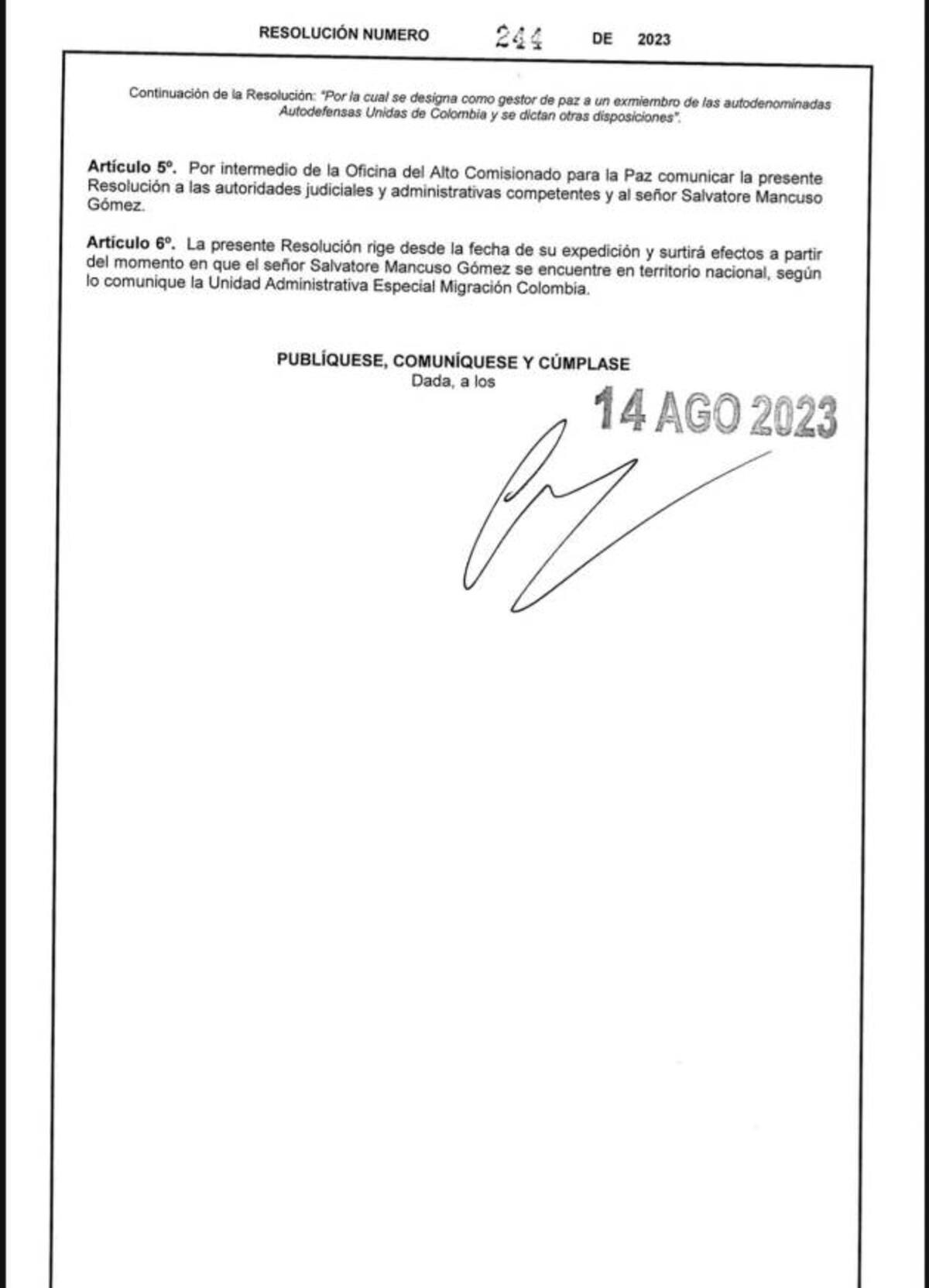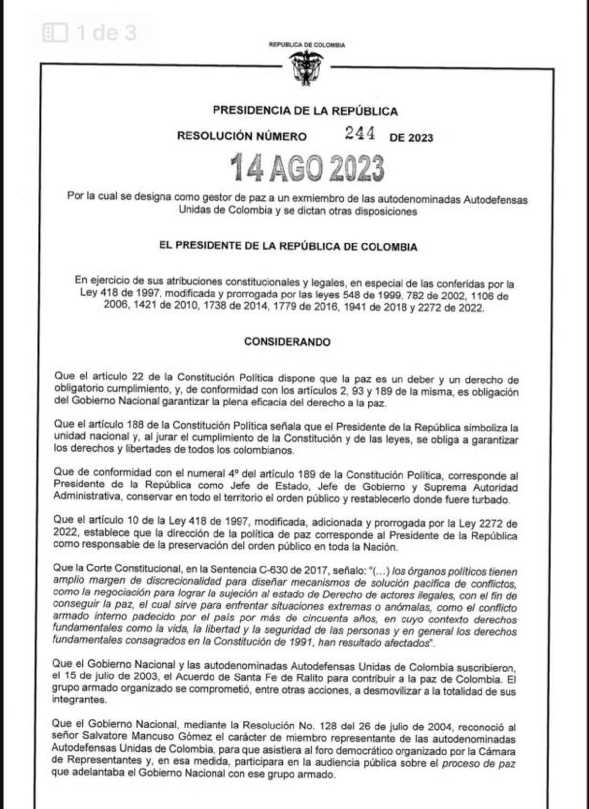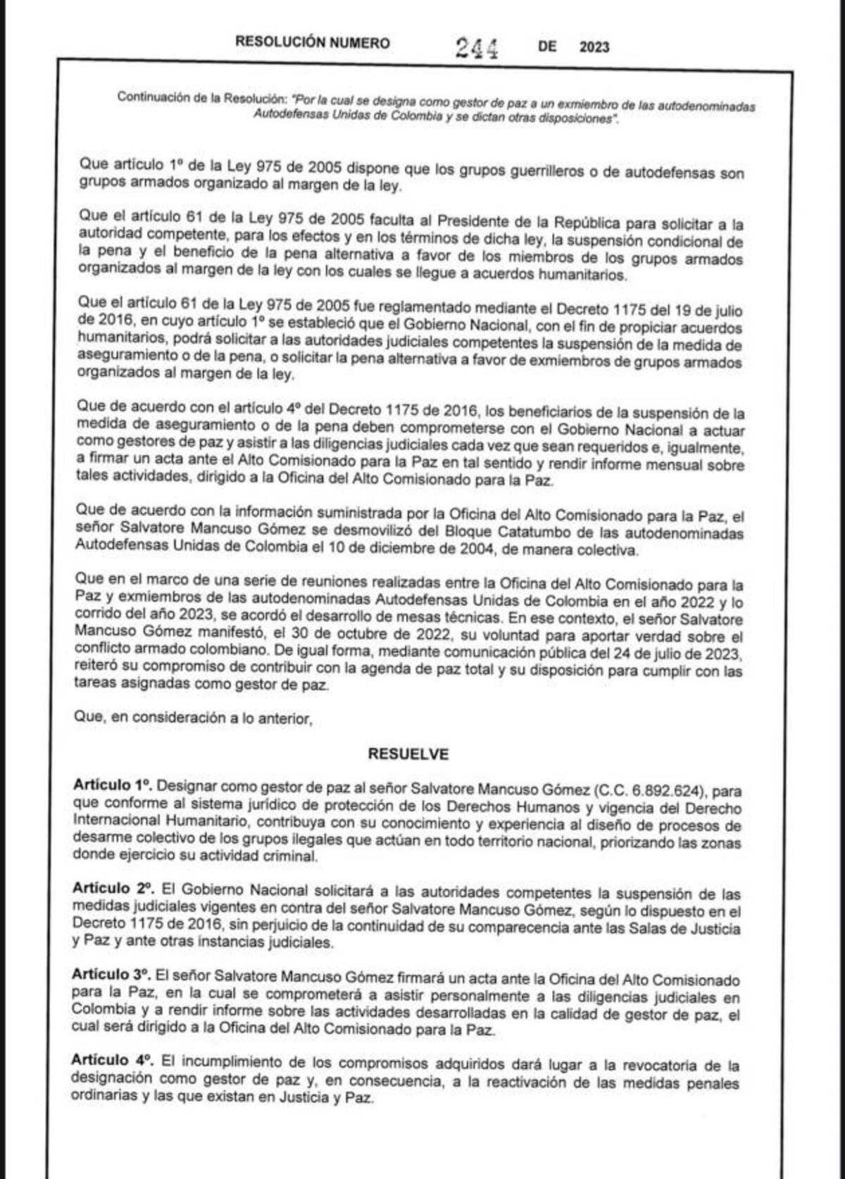 Por medio de la resolución 244 de 2023, el presidente Gustavo Petro hizo oficial el nombramiento de Salvatore Mancuso Gómez como nuevo gestor de paz.