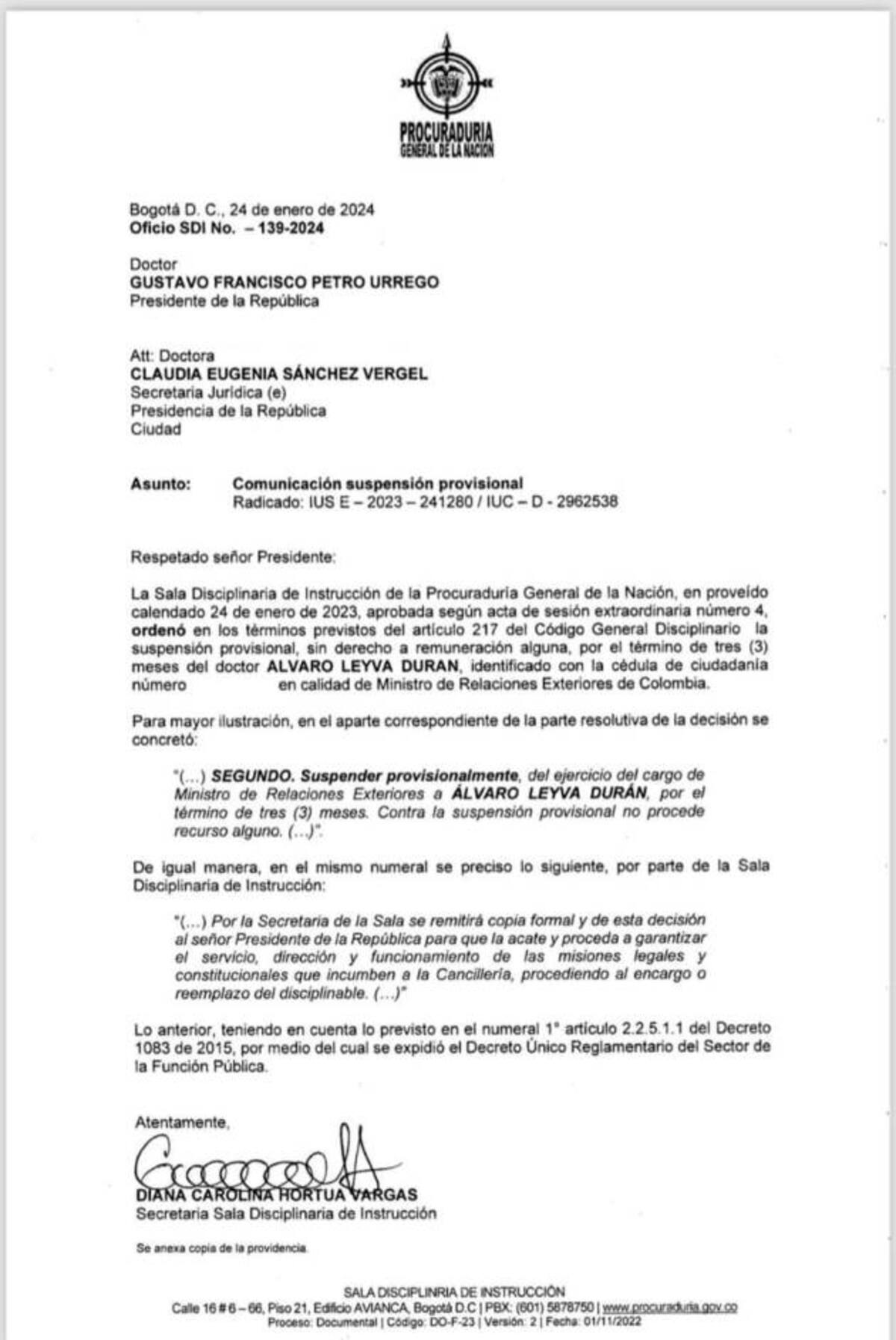 La Procuraduría General notificó al Gobierno, mediante oficio 139-2024, la suspensión provisional del cargo por tres meses del canciller Álvaro Leyva, investigado por supuestas irregularidades en el proceso de licitación de los pasaportes. Lea aquí: Suspendieron al canciller Leyva y le abrieron pliego de cargos