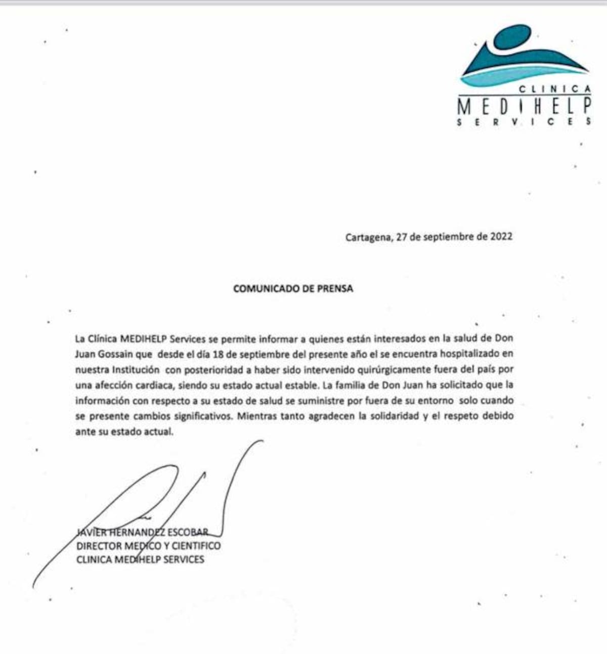 “La Clínica Medihelp Services se permite informar a quienes están interesados en la salud de don Juan Gossain que desde el día 18 de septiembre del presente año se encuentra hospitalizado en nuestra institución”, comienza el texto, firmado por Javier Hernández Escobar, director médico y científico de la institución.