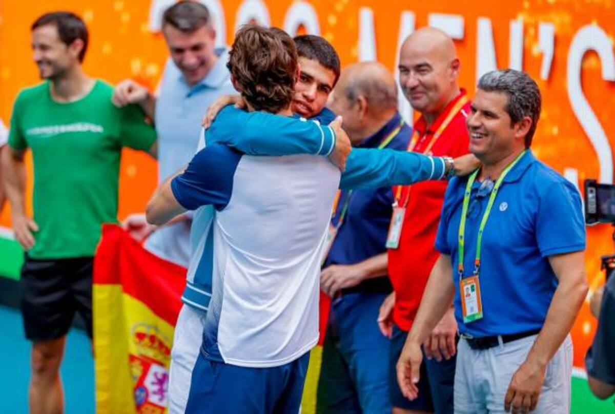 Nada más ganar el torneo, Alcaraz se fue hacia la grada para abrazar a su entrenador Juan Carlos Ferrero, que había llegado a última hora a Miami para acompañarle después de irse a España por el fallecimiento de su padre.