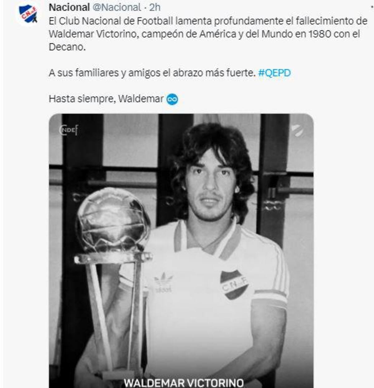 “Lamentamos con profunda tristeza y conmoción el fallecimiento del exjugador de la Selección Uruguaya, Gloria Celeste, Waldemar Victorino. Nuestras condolencias a sus familiares y amigos. Q.E.P.D.”, transmitió la AUF.