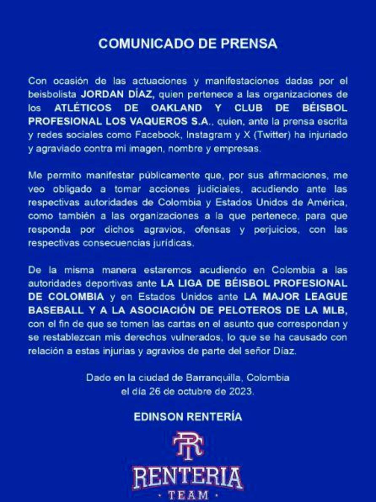 En días pasados, el Grandes Ligas de los Atléticos de Oakland, Jordan Díaz, hizo unas acusaciones a Edison Rentería, dueño de algunos equipos del béisbol profesional, en sus redes sociales. Lea aquí: ¡No se guardó nada!: Jordan Díaz arremetió contra Edinson Rentería