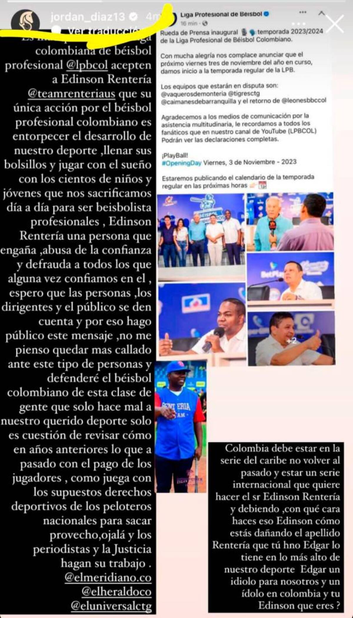 “Espero que el público y los dirigentes se den cuenta y por eso hago público este mensaje, no me pienso quedar más callado ante este tipo de personas (Edinson Rentería) y defenderé el béisbol colombiano de esta clase de gente que solo le hace mal a nuestro querido deporte. Es cuestión de revisar cómo en años anteriores lo que le ha pasado con el pago de los jugadores, cómo juega con los supuestos derechos deportivos de los peloteros para sacar provecho. Ojalá los periodistas y la justicia hagan su trabajo”, escribió el pelotero de Montería en su cuenta de Instagram.
