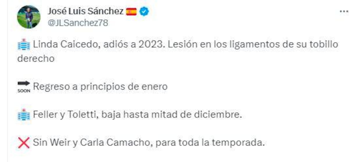 La noticia fue confirmada por el respetado periodista deportivo José Luis Sánchez, conocido por su labor en El Chiringuito. Sánchez, a través de su cuenta en X (antigua Twitter), fue el primero en dar a conocer la situación de salud de Linda Caicedo, señalando que se trata de una lesión en los ligamentos de su tobillo derecho. Lamentablemente, esto implica también su ausencia en los próximos encuentros amistosos de la Selección Colombia de mayores.