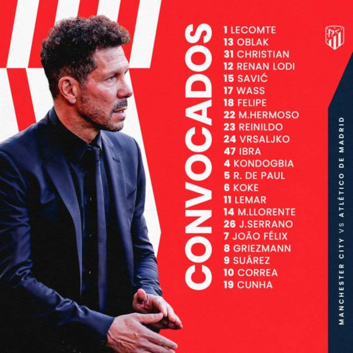 El resto de la plantilla del primer equipo forma parte de la convocatoria (los porteros Jan Oblak y Benjamin Lecomte; los defensas Daniel Wass, Sime Vrsaljko, Stefan Savic, Felipe Monteiro, Reinildo Mandava, Mario Hermoso y Renan Lodi; los medios Marcos Llorente, Koke Resurrección, Geoffrey Kondogbia, Rodrigo de Paul y Thomas Lemar; y los delanteros Luis Suárez, Antoine Griezmann, Joao Félix, Matheus Cunha y Ángel Correa) más los canteranos Christian, portero; Ibra, defensa; y Javi Serrano, medio centro. Le puede interesar: Cuartos de final de la Champions League: conozca los resultados del sorteo