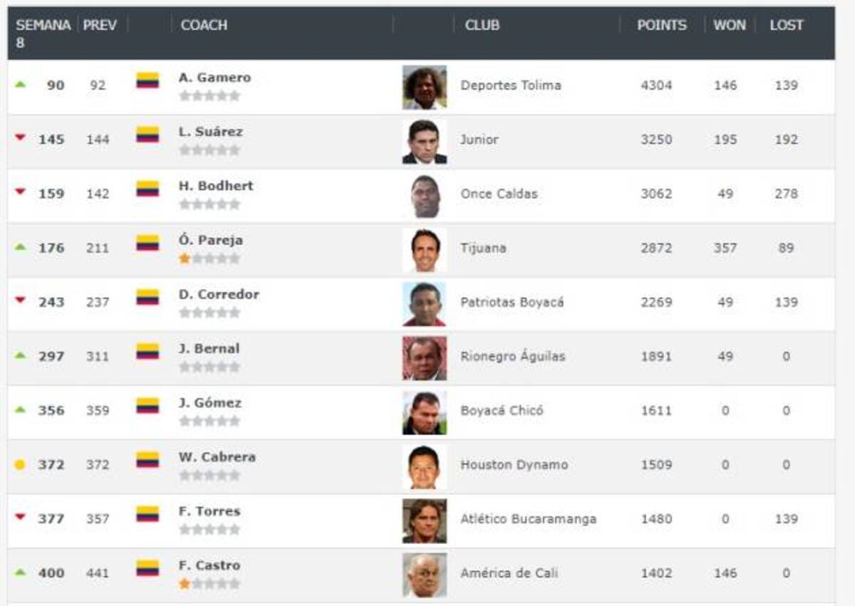 El primer lugar del ranking lo ocupa Alberto Gamero, técnico de Deportes Tolima, con 4304 puntos. En la clasificación mundial, que lidera el argentino Marcelo Gallardo, el samario está en el puesto 90.