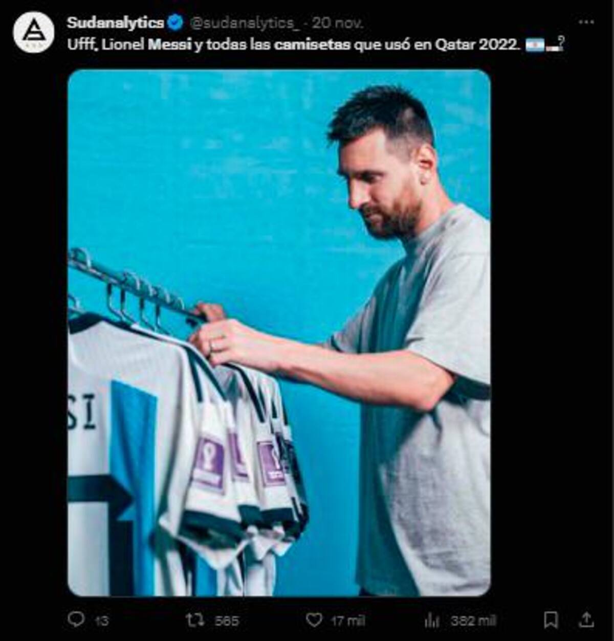 Las seis camisetas incluyen dos que Messi vistió en la fase de grupos: una de la preocupante derrota frente a Arabia Saudí (1-2) y otra de la sufrida victoria frente a México (2-0).