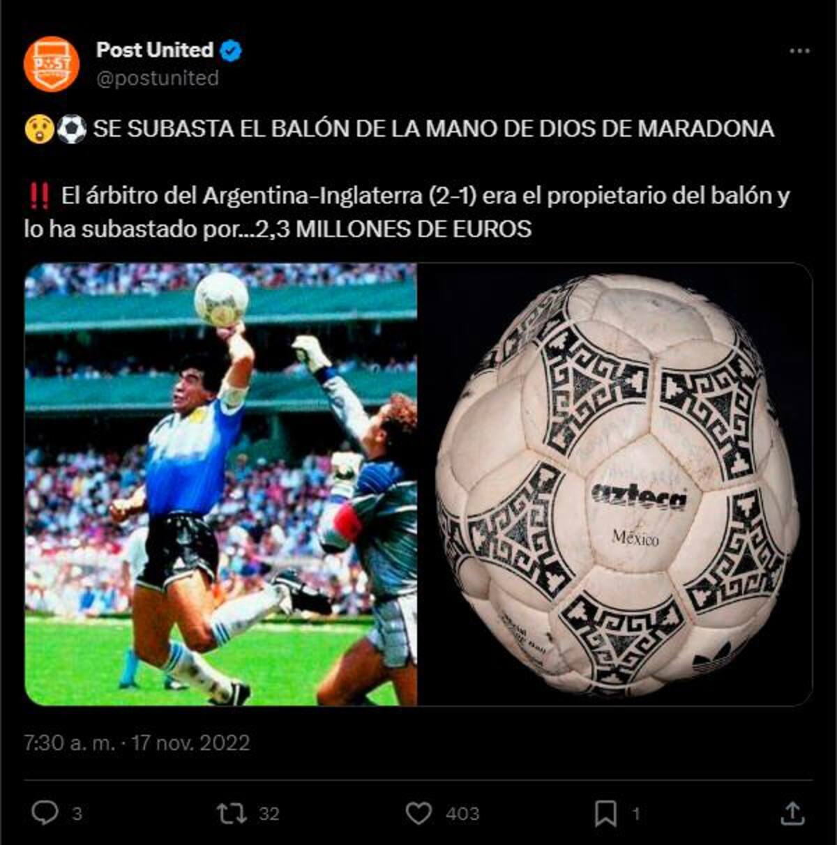 9,3 millones de dólares alcanzó en 2022 en Sotheby’s Londres la camiseta del partido de ‘La mano de Dios’