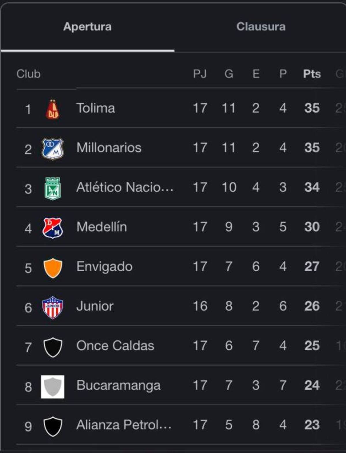 En la quinta casilla se ubica Envigado (27), seguido en su orden por Atlético Junior (26), Once Caldas (25) y Atlético Bucaramanga (24), que cierra el grupo de los ocho. Le puede interesar: Medellín no pudo con Unión Magdalena de local