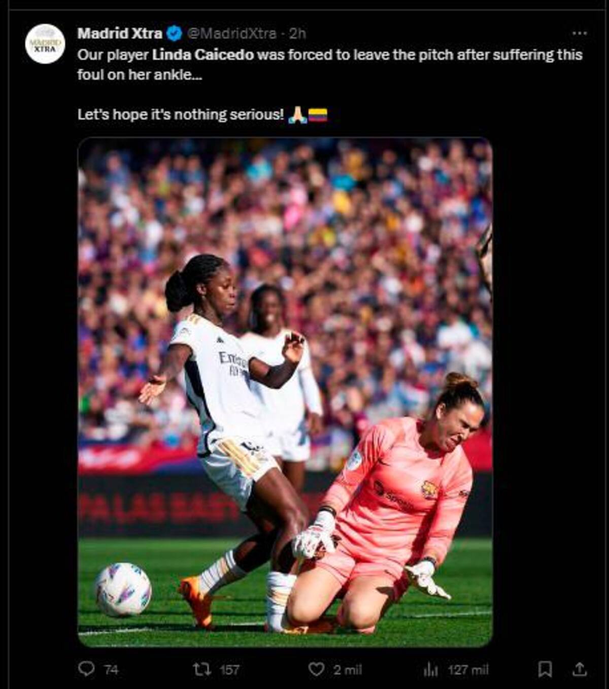 El partido no fue bueno para el Madrid debido a la goleada que terminó sufriendo (5-0) en condición de visitante y la lesión de la delantera. Los goles de las locales fueron de Aitana, Hansen, Mariona, Claudia Pina y Vicky López. Otra baja en la Selección Colombia: Deiver Machado no estará ante Paraguay.