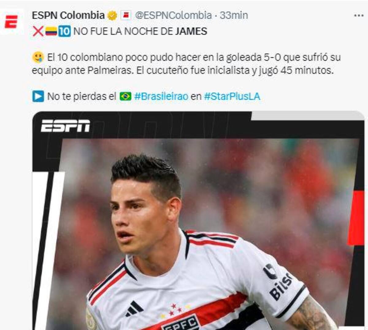Sao Paulo, equipo del colombiano James Rodríguez, cayó goleado 0-5 ante el Palmeiras en la jornada 29 del Brasileirao, cuyo partido se jugó en la noche de este miércoles.