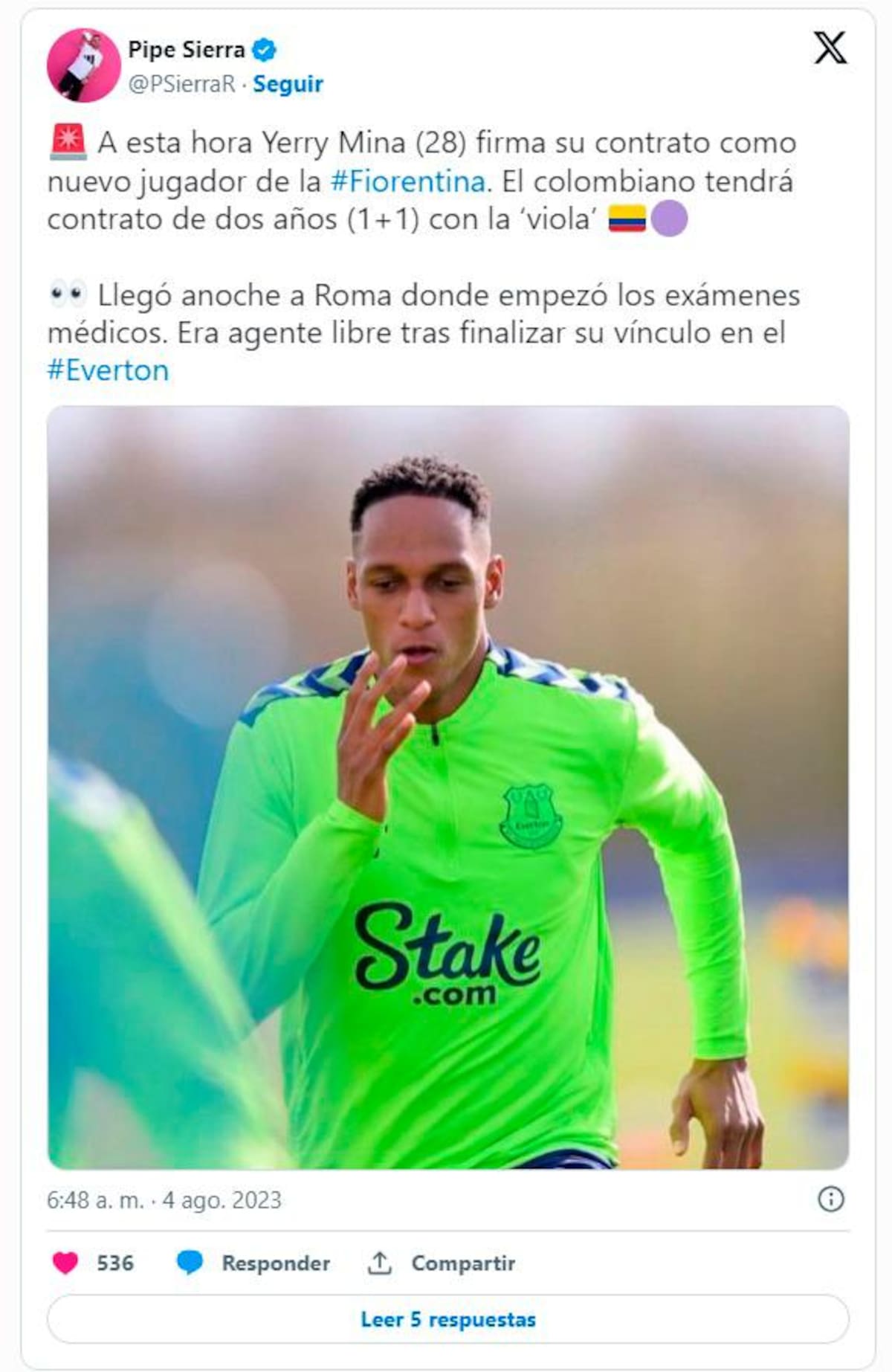 La Fiorentina, un equipo que ha tenido grandes colombianos como Juan Guillermo Cuadrado, será el nuevo hogar de Yerry Mina. El contrato será por un año, con la posibilidad de extenderlo por otro. Aunque su salario tendrá una reducción en comparación con lo que ganaba en Inglaterra, no es algo significativo. Mina ahora se encuentra en el proceso de completar los exámenes médicos, aunque el contrato ya ha sido firmado.