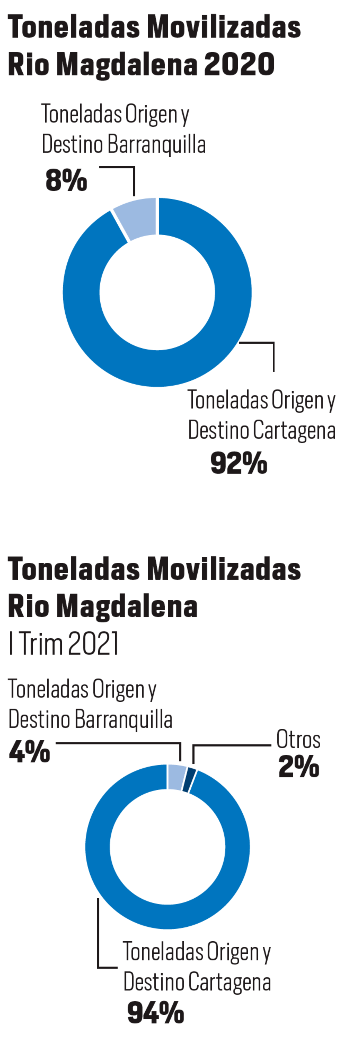 En el periodo, por esas arterias se movilizaron 737.238 toneladas y de ese total Cartagena participa con el 94% de la carga, ganado 2 puntos porcentuales con respecto a su participación en todo el 2020 cuando fue del 92%.