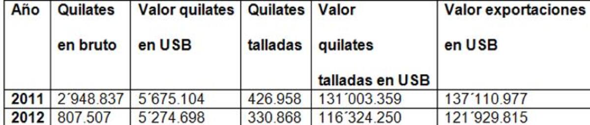 Las cifras globales de la Federación Nacional de Esmeraldas, que reúne a productores, comercializadores y exportadores, precisan que comparando 2011 y 2012, como años completos, la baja en el mercado de las gemas es de 11%.
