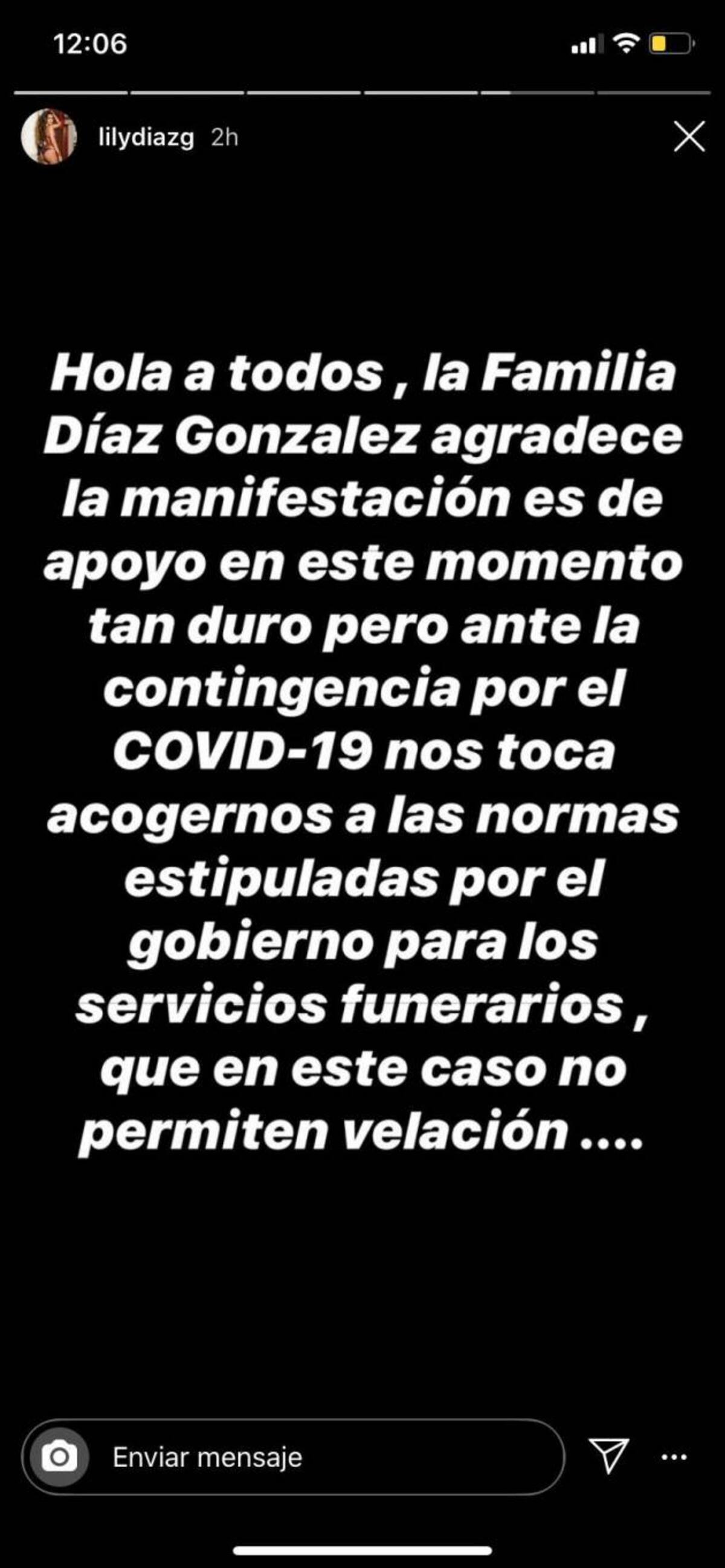 A través de su cuenta en Instagram, su hermana Lili Díaz, agradeció a todos aquellos que le han enviado mensajes, a ella y a su familia, de fortaleza en este duro momento y de inmediato confirmó que Moisés no podrá ser velado como tradicionalmente se hace. “Hola a todos, la familia Díaz González, agradece la manifestación es de apoyo en este momento tan duro pero ante la contingencia por el Covid-19 nos toca acogernos a las normas estipuladas por el Gobierno para los servicios funerarios, que en este caso no permiten velación”, escribió la bella joven, que de inmediato le aconsejó a sus allegados que se queden en casa. “Infinitas gracias por todos sus mensajes. En este momento me siento muy triste pero la situación me obliga a solicitarles su comprensión en este momento, por favor, quédate en casa”, finalizó.