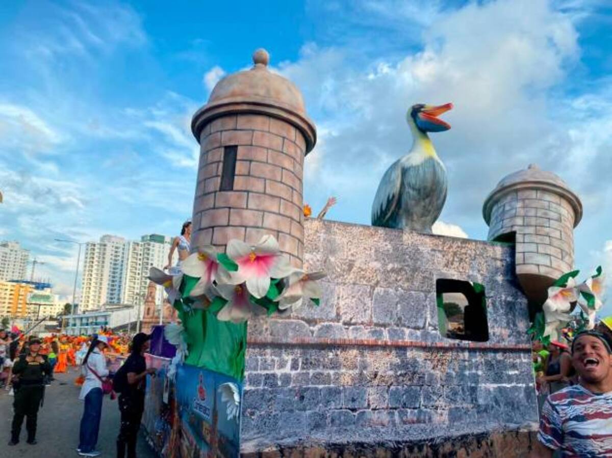 Hizo su entrada la carroza que representa la Ciudad Amurallada, en la punta tiene un ave blanca, en su parte trasera se puede apreciar la emblemática iglesia San Pedro Claver y a sus costados hermosas flores blancas.