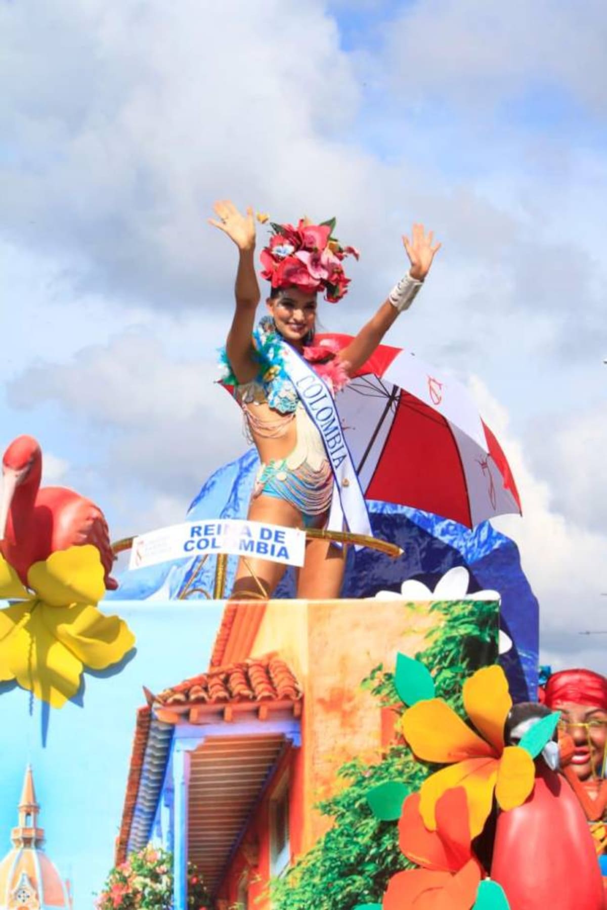 La Señorita Colombia, Valentina Espinosa, hizo su entrada en una colorida carroza llena de elementos representativos de nuestra nación como el sombrero vueltiao, la carroza además iba acompañada con flores y un hermoso color verde.