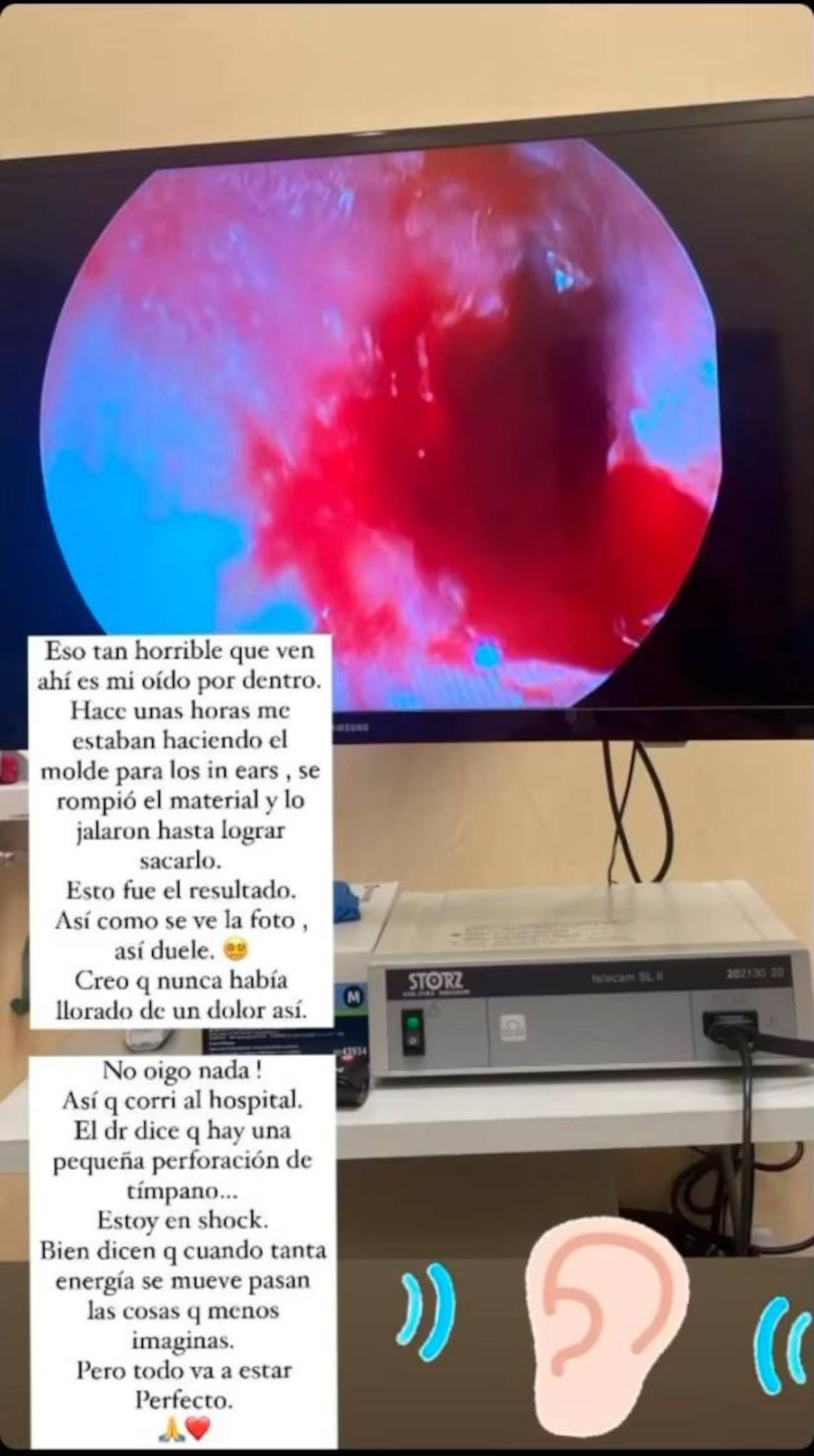 A través de las historias de la red social, la cantante y actriz publicó unas imágenes donde dio los detalles de lo que le había ocurrido y que terminó en una situación angustiante. Se trata de una lesión al interior de su oído, pues tiene un desgarro en el tejido fino que separa el conducto auditivo del oído medio.