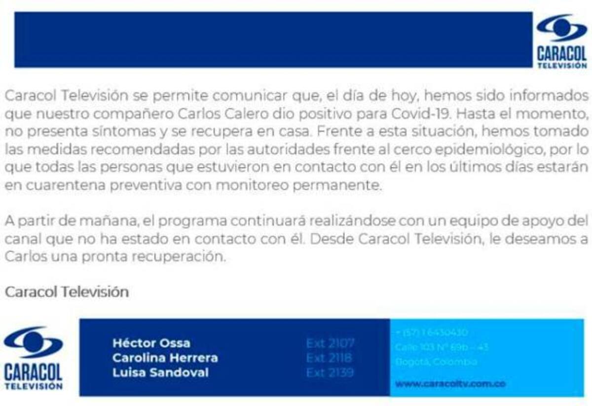 Seguidamente Caracol anunció que Día a Día continuará con otro personal que no ha estado en contacto con el barranquillero. “A partir de mañana, el programa continuará realizándose con un equipo de apoyo del canal que no ha estado en contacto con él. Desde Caracol Televisión, le deseamos a Carlos una pronta recuperación”, finaliza el escrito.