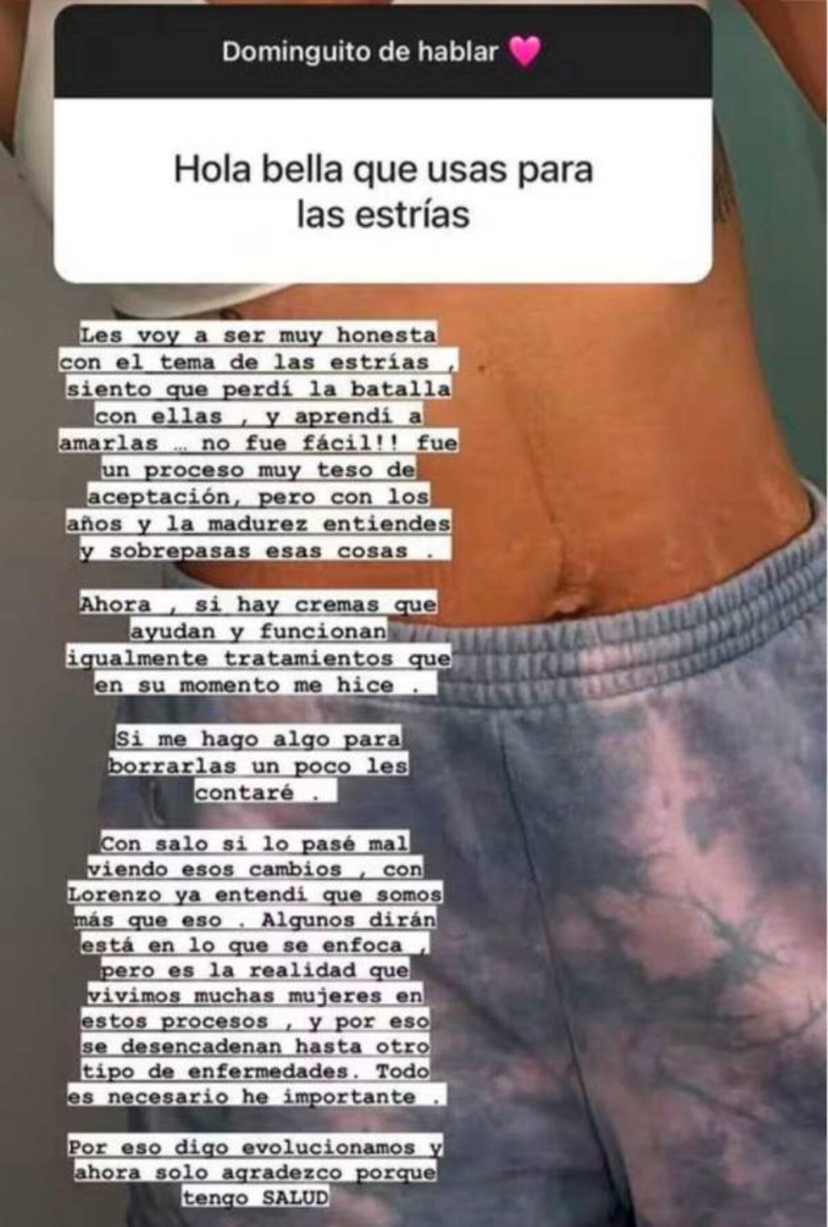 “Sentí que perdí la batalla con ellas y aprendí a amarlas... ¡no fue fácil! Fue un proceso muy teso de aceptación, pero, con los años y la madurez, entiendes y sobrepasas esas cosas. Ahora, sí hay cremas que ayudan y funcionan, igual tratamientos que en su momento me hice”, dice en la historia de Instagram, en la que muestra una imagen de su abdomen. Lea: ¿Daniela Ospina está esperando gemelos? Este pequeño detalle hizo creerlo