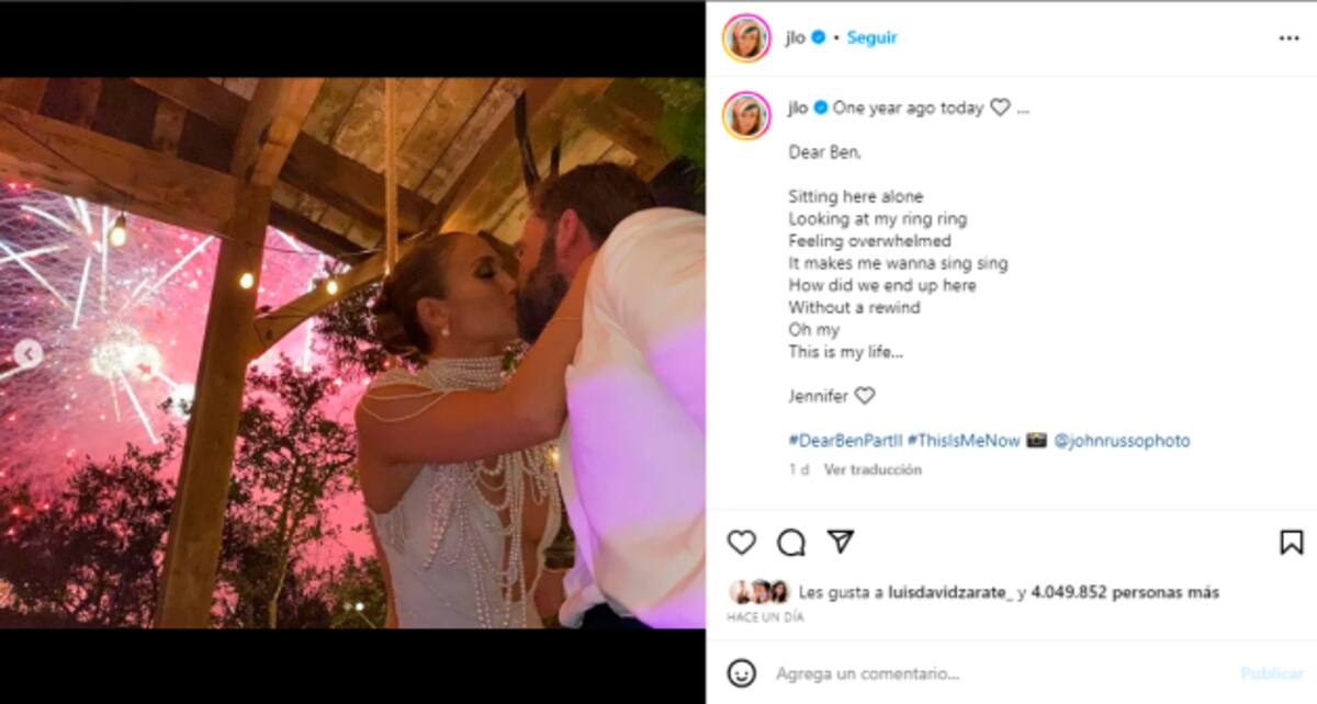 “Querido Ben, Sentada aquí sola, mirando mi anillo anillo, sentirse abrumada, me hace querer cantar cantar. Cómo hemos acabado aquí, sin rebobinar, Oh mi... Esta es mi vida. Jennifer”, escribió la cantante en su publicación, que ya cuenta con casi 4 millones de likes y miles de comentarios en los que no solo le desean los mejores éxitos a esta pareja, sino que también resuenan muchas cuestiones de dicho texto, pues parece un apartado de lo que sería una de sus nuevas canciones.