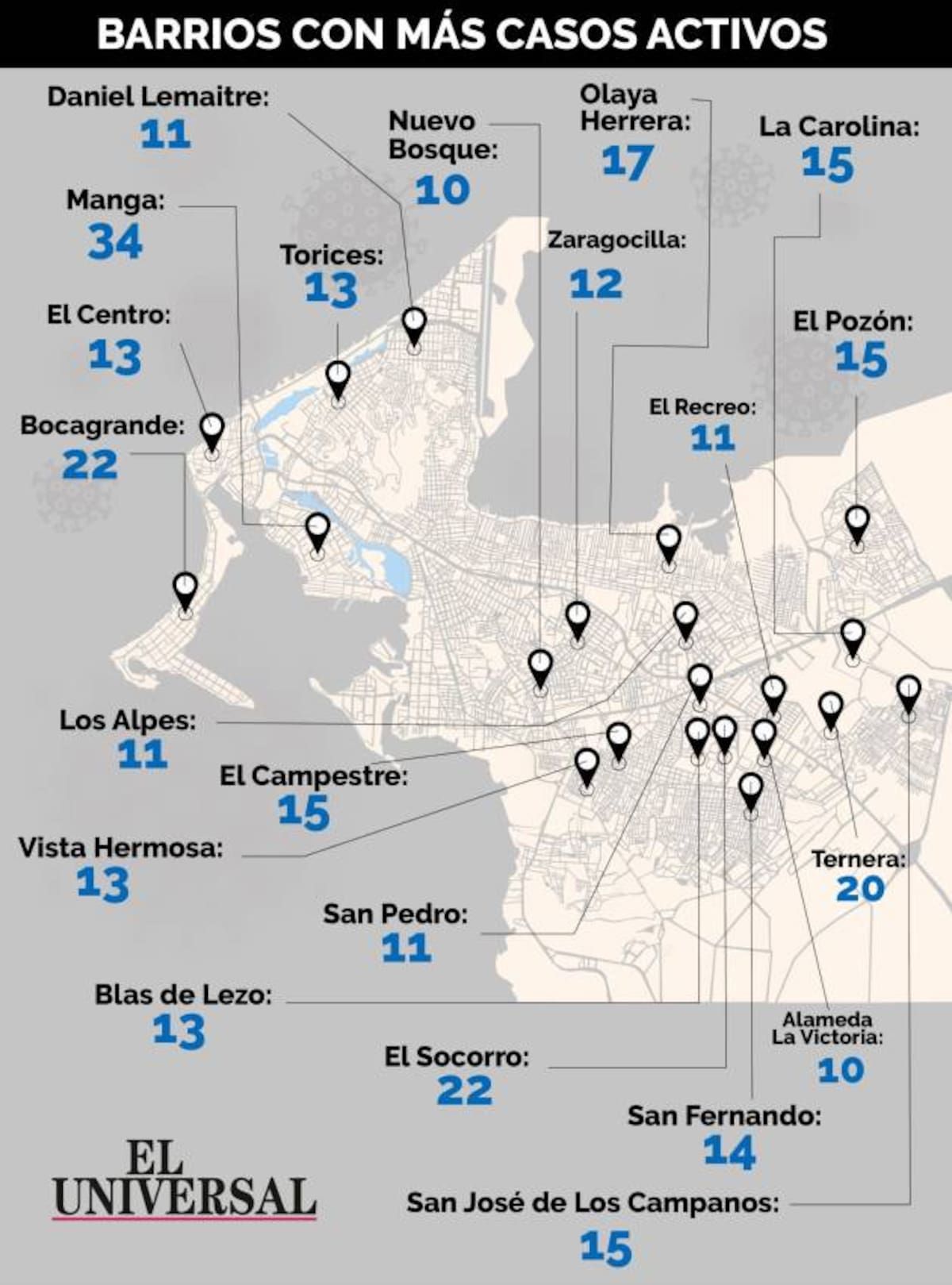 A la fecha, los 21 barrios con más casos activos son Manga (34 activos); Bocagrande (22); El Socorro (22); Ternera (20); Olaya Herrera (17); El Pozón (15); El Campestre (15); La Carolina (15); San José de Los Campanos (15); San Fernando (14); Blas de Lezo (13); El Centro (13); Torices (13); Vista Hermosa (13); Zaragocilla (12); Los Alpes (11); Daniel Lemaitre (11); San Pedro (11); El Recreo (11); Alameda La Victoria (10) y Nuevo Bosque (10).
