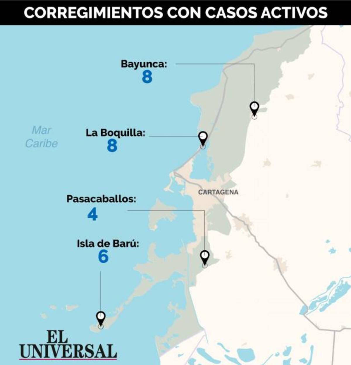Hasta el momento solo cuatro corregimientos de Cartagena tienen casos activos de coronavirus: La Boquilla (216 casos totales): 8 activos, 6 fallecidos y 202 recuperados:; Bayunca: (201 casos totales): 8 activos, 8 fallecidos y 185 recuperados; Isla de Barú: (47 casos totales): 6 activos, 0 fallecidos y 41 recuperados; y Pasacaballos (410 casos totales): 4 activos, 10 fallecidos y 396 recuperados.