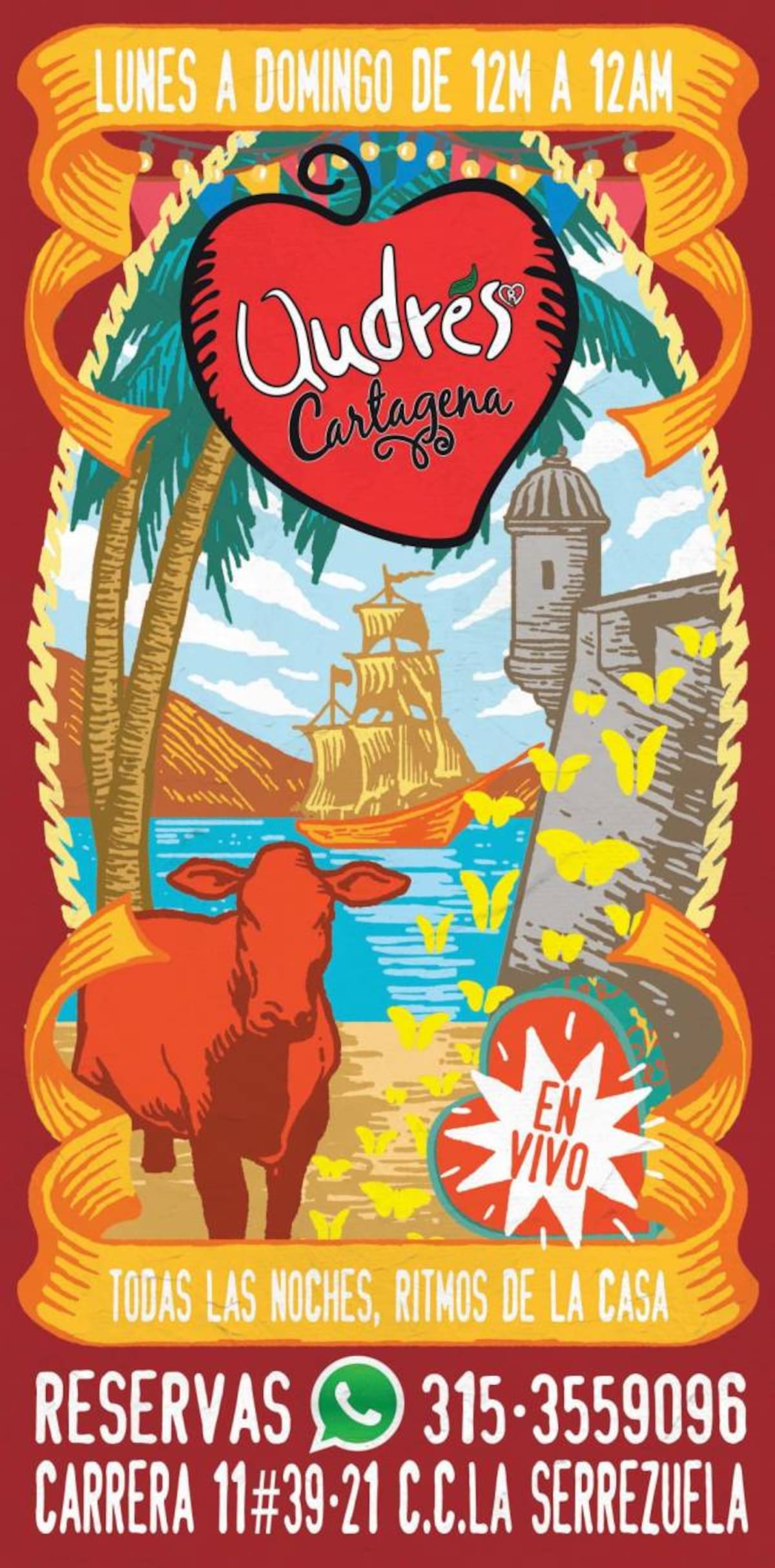 Andrés Cartagena permanecerá abierto de lunes a domingo durante toda la temporada de vacaciones en el horario de 12:00 m a 12:00 am. Las reservas se podrán hacer por medio de la línea 315 355 9096 (WhatsApp) o por la página web en www.andrescarnederes.com