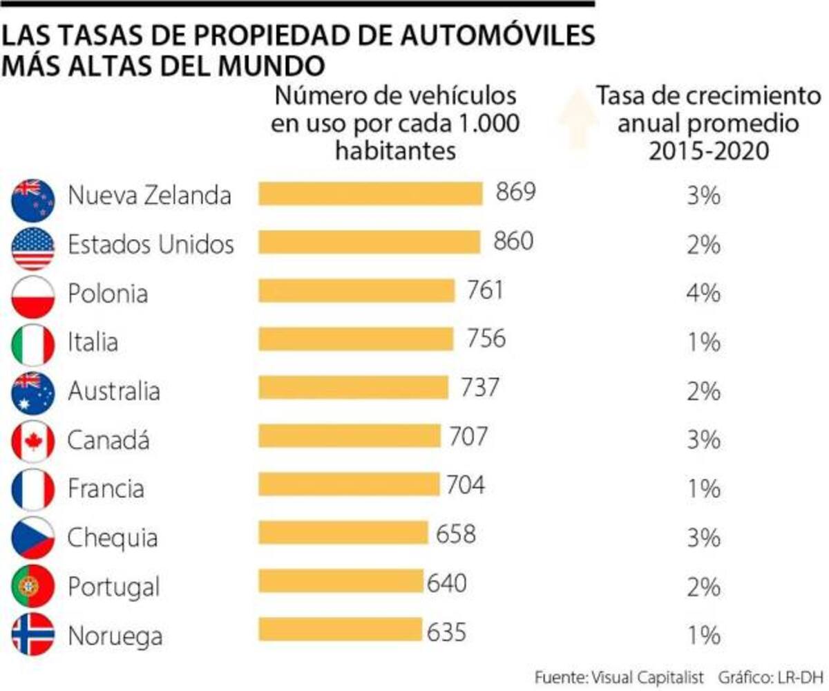 En el segundo lugar ya se encuentra la gran potencia, Estados Unidos, con una diferencia corta, pues registró 860 autos por cada 1.000 habitantes. La tasa de crecimiento promedio anual se ubica en 2%, un punto por debajo de la de Nueva Zelanda (3%).