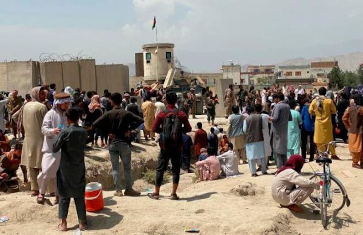 Afganos se reúnen frente al aeropuerto internacional Hamid Karzai para huir del país.
