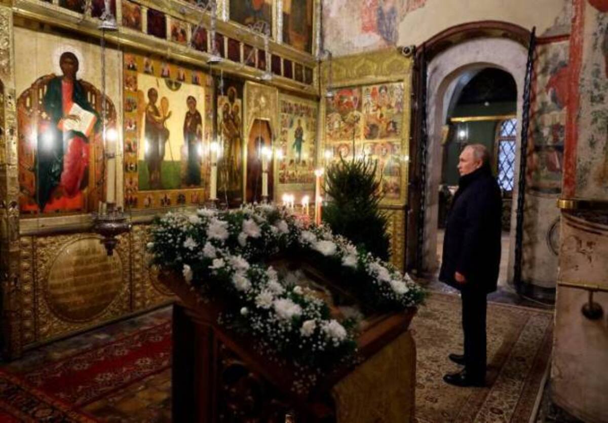 En las imágenes de televisión se vio al presidente completamente solo en la Catedral de la Anunciación del Kremlin en una Navidad blanca marcada por las bajas temperaturas, que rondaron los 25 grados bajo cero.