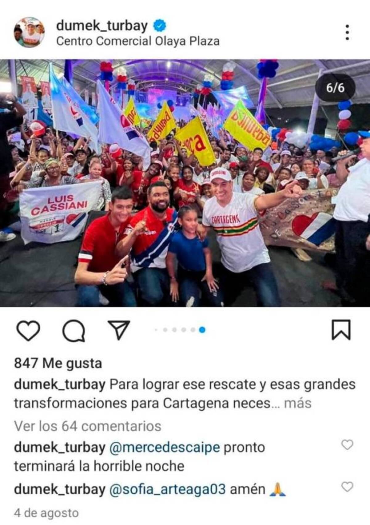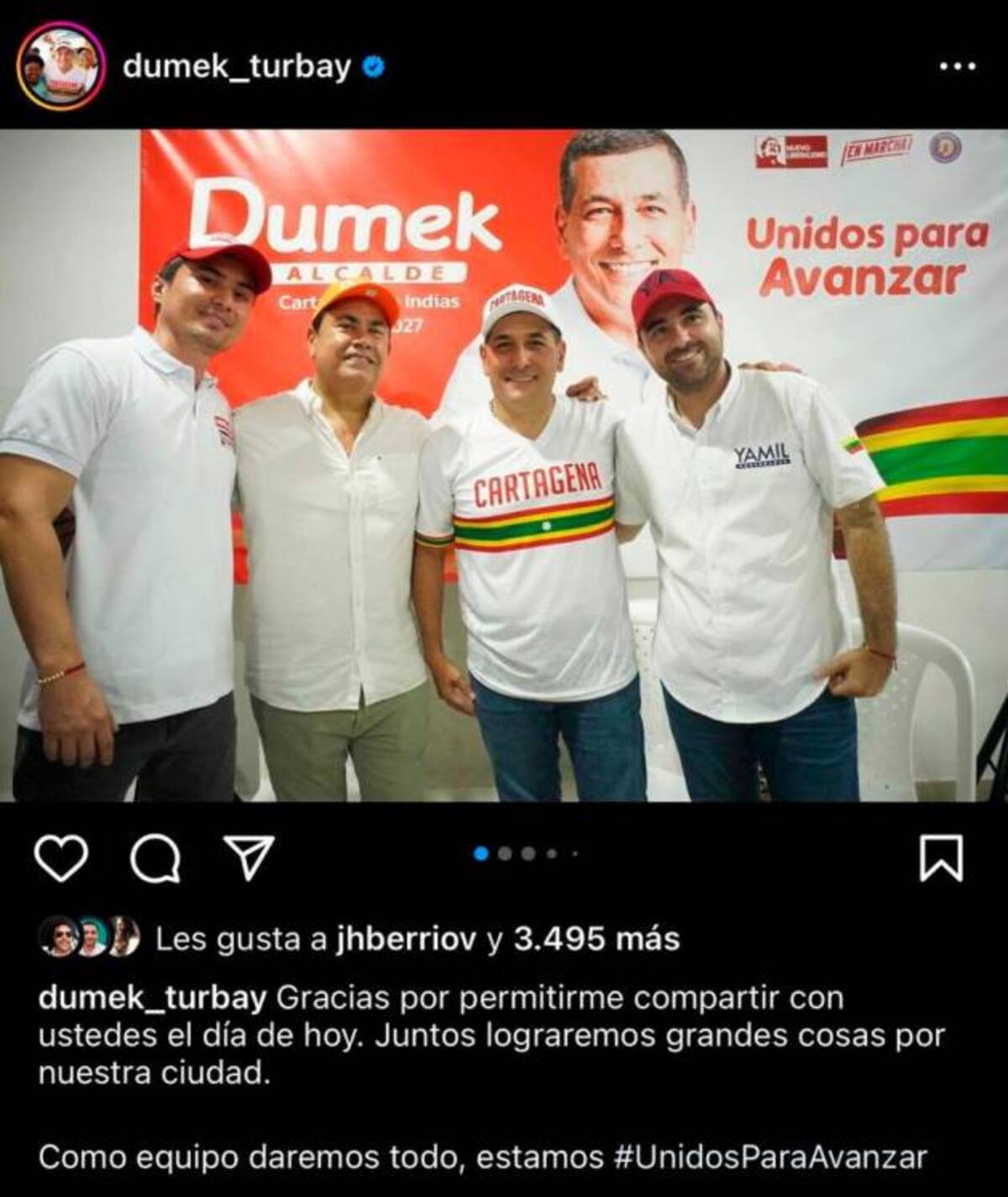 Publicación de Dumek Turbay junto al concejal Luis Cassiani de Cambio Radical.