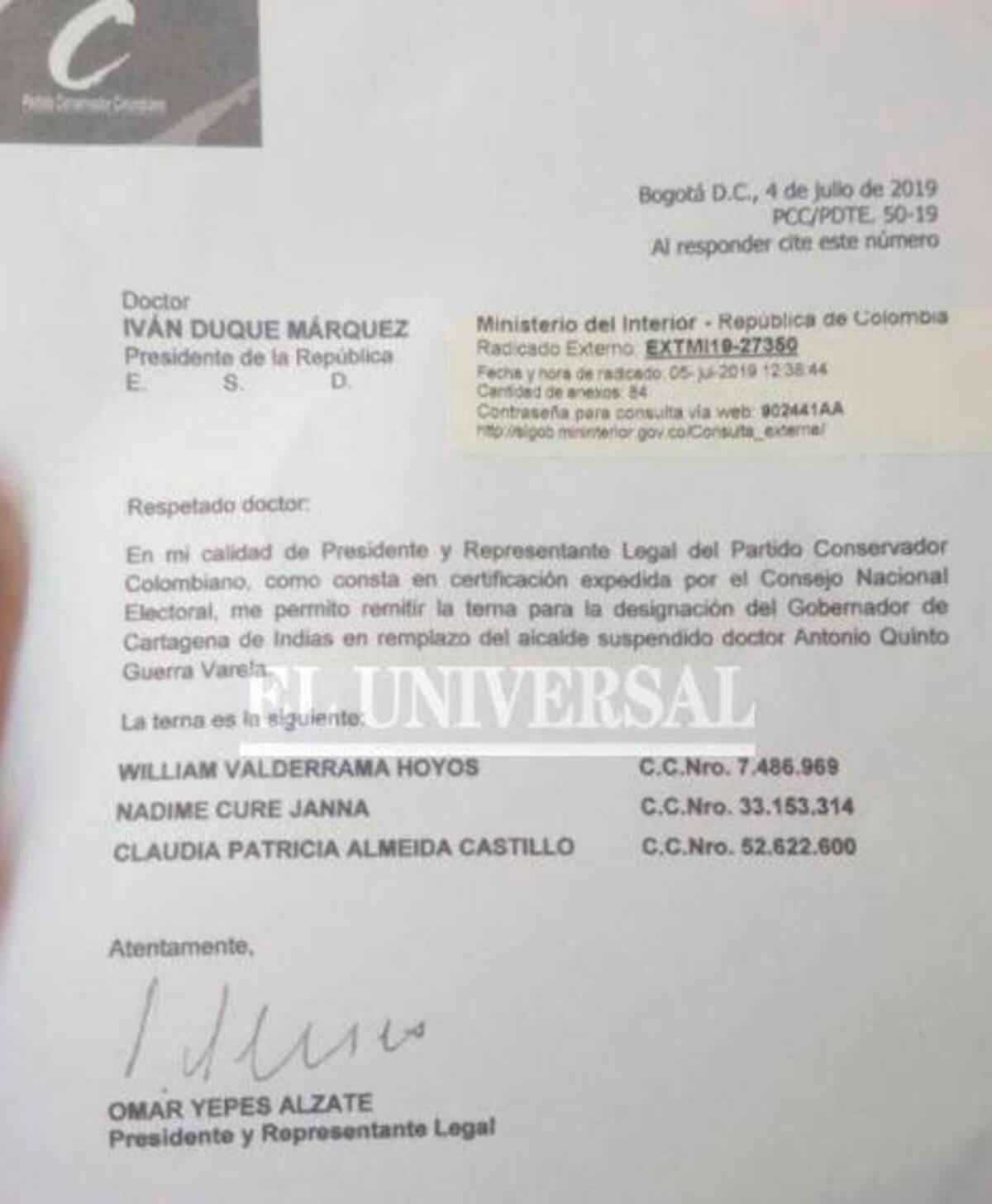 “En mi calidad de presidente y representante legal del Partido Conservador Colombiano, como consta en certificación expedida por el Consejo Nacional Electoral, me permito remitir la terna para la designación del Gobernador de Cartagena de Indias en remplazo del alcalde suspendido, doctor Antonio Quinto Guerra Varela”, dice un aparte del documento.