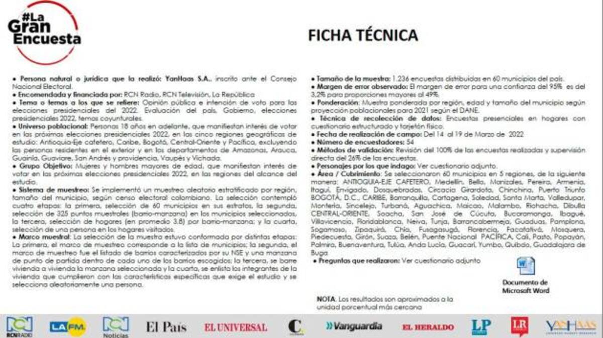 Esta medición, de acuerdo con la ficha técnica de Yanhas, se ejecutó entre el 14 y el 19 de marzo pasados; se realizaron 1.236 encuestas en 60 municipios, y se estima que el margen de error es del 3,2 por ciento.