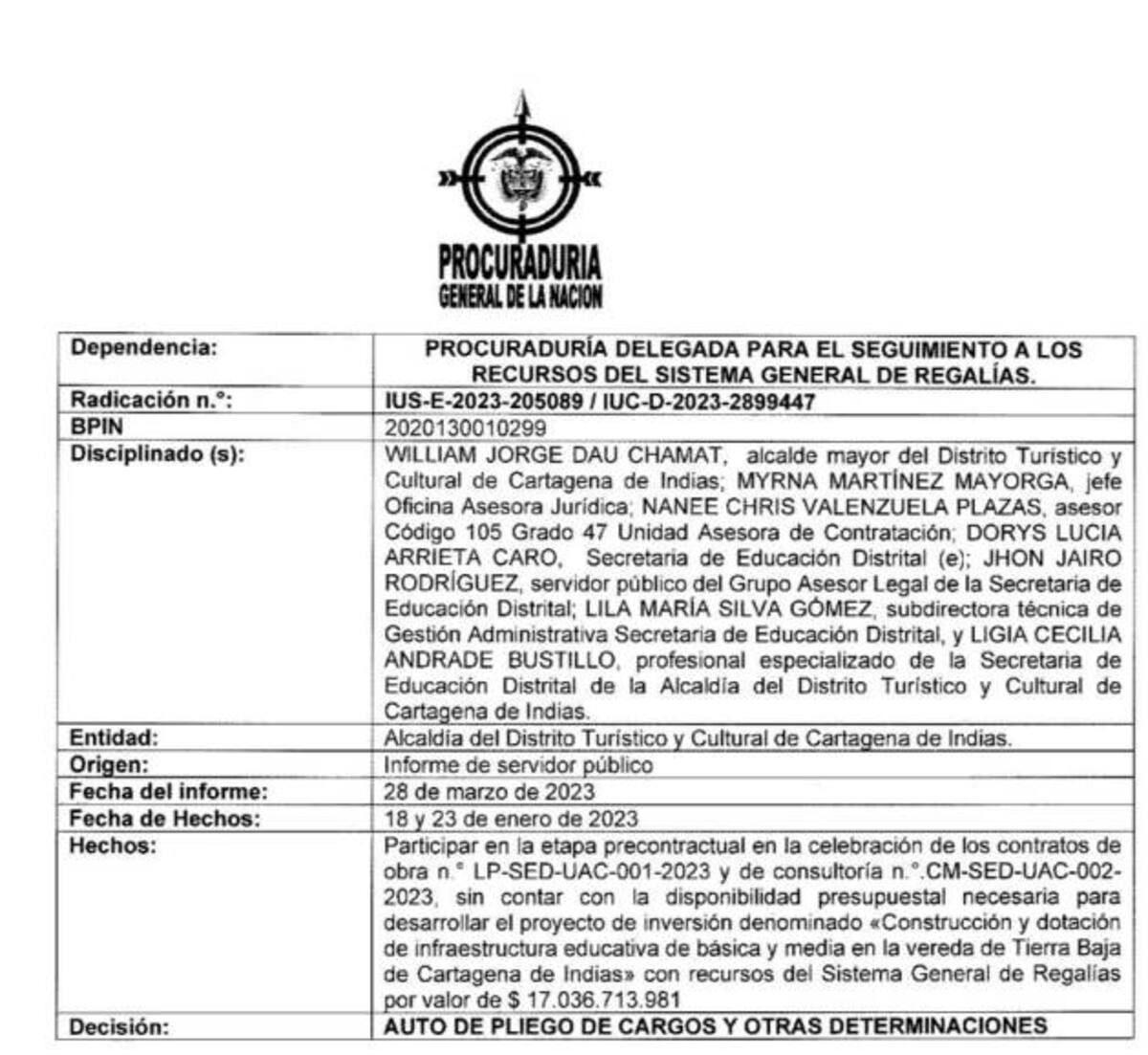 A 17 días de entregar su cargo a Dumek Turbay, nuevo alcalde de Cartagena, William Dau enfrenta su primer bache del 2024: la Procuraduría le formuló pliego de cargos por presuntas irregularidades en un multimillonario contrato.