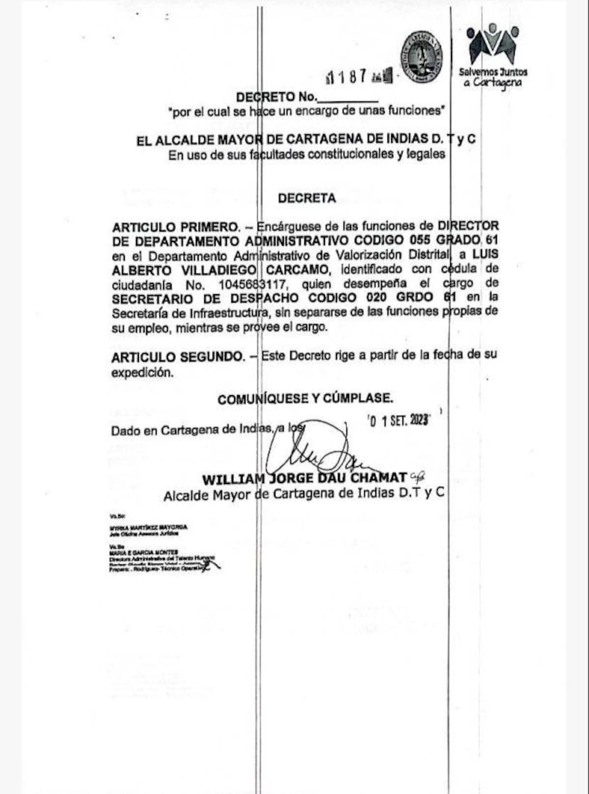 Mediante el Decreto 1187 del 01 de septiembre de 2023, el alcalde William Dau designó a Luis Villadiego Cárcamo, actual secretario de Infraestructura, como director encargado de Valorización.