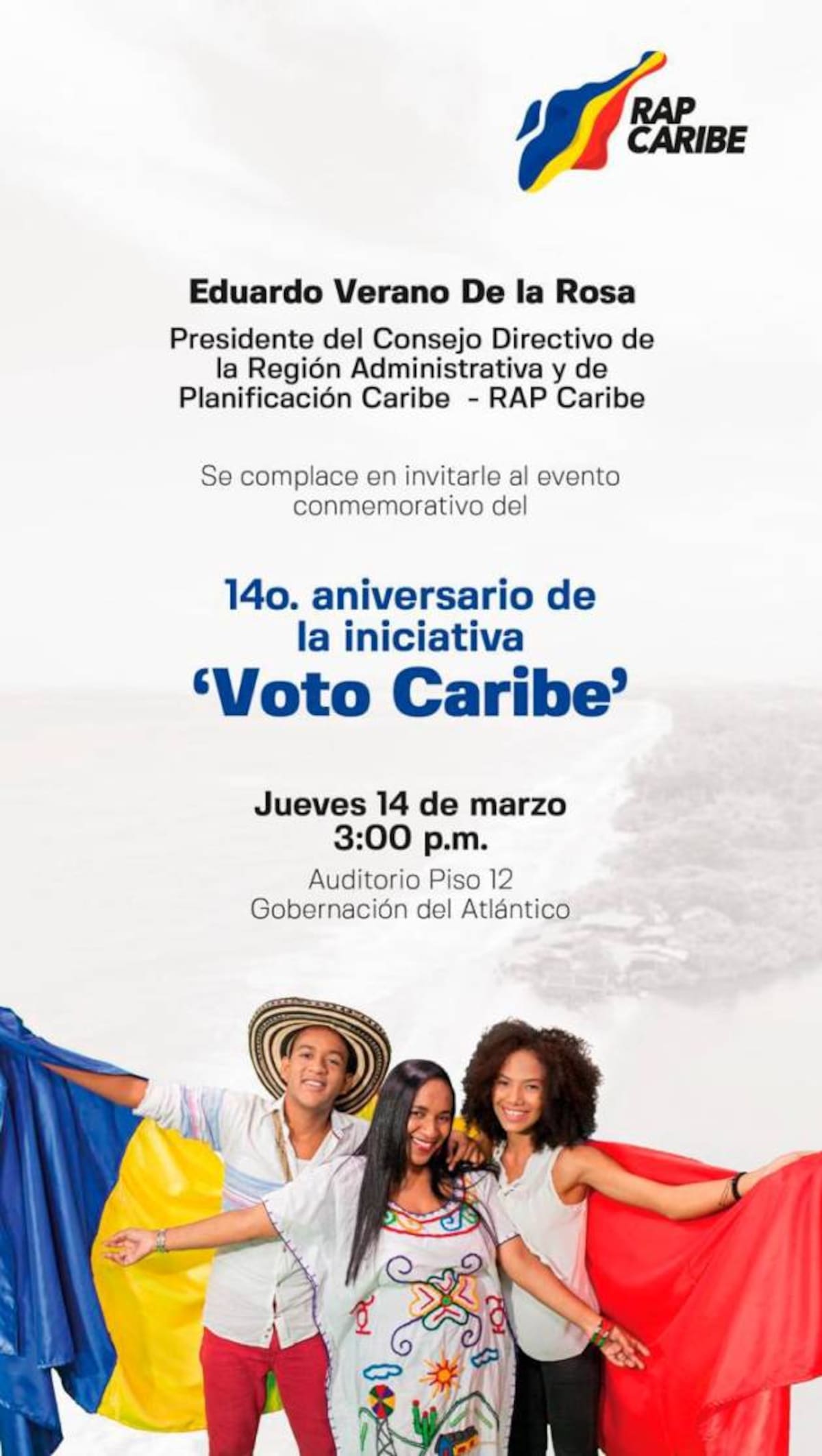 El gobernador del Atlántico, Eduardo Verano, quien hace las veces de presidente de la RAP Caribe, invita al acto conmemorativo del 14 de marzo.