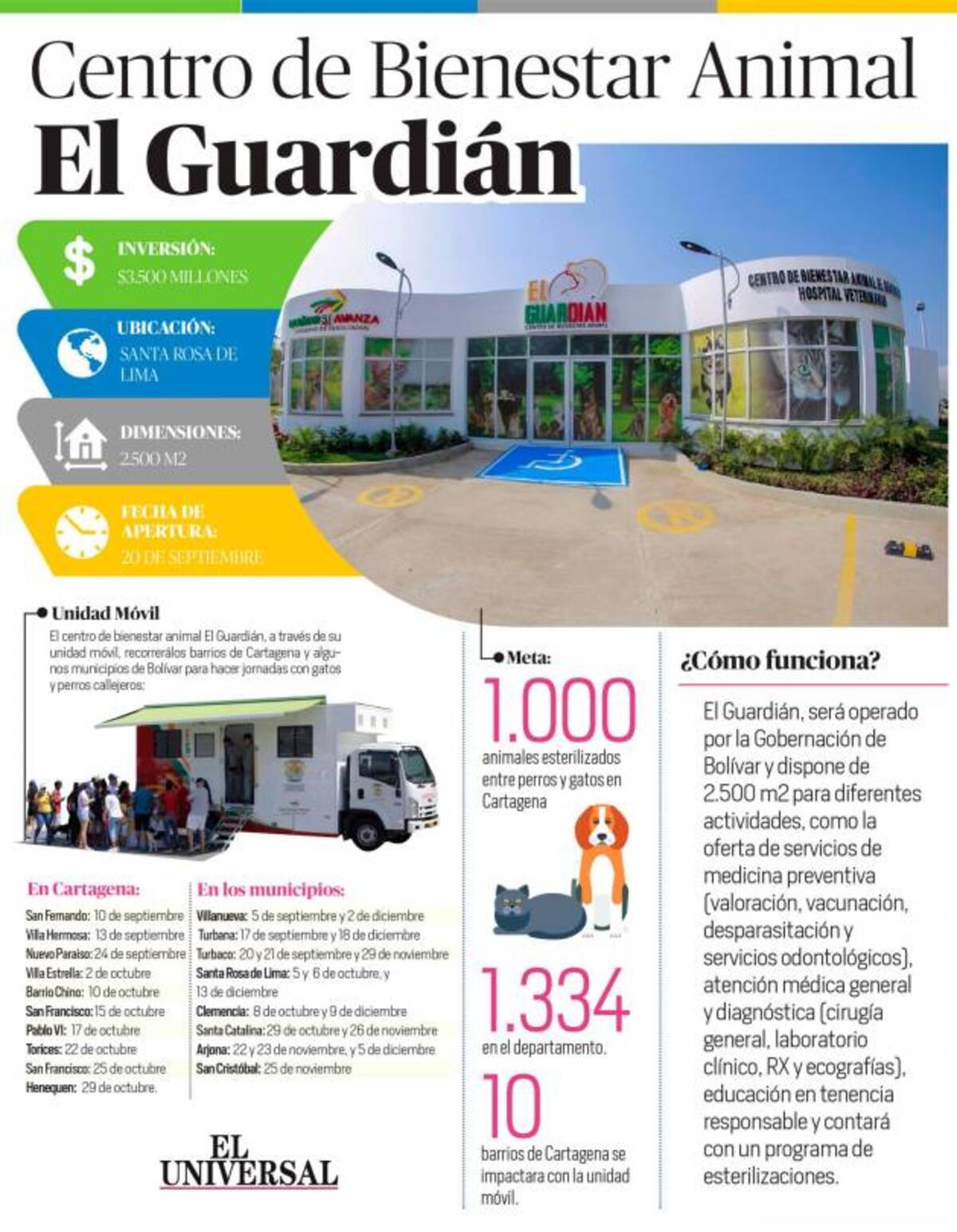 ‘El Guardián será operado por la Gobernación de Bolívar y dispone de 2.500 m2 para diferentes actividades, como la oferta de servicios de medicina preventiva (valoración, vacunación, desparasitación y servicio odontológicos), atención médica general y diagnóstica (cirugía general, laboratorio clínico, RX y ecografías), educación en tenencia responsable y contará con un programa de esterilizaciones.