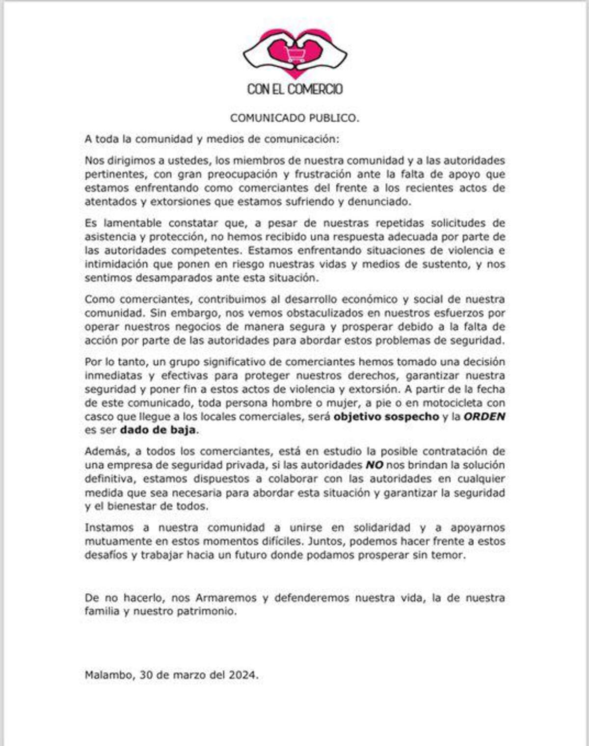 “Un grupo significativo de comerciantes hemos tomado una decisión inmediata y efectiva para proteger nuestros derechos, garantizar nuestra seguridad y poner fin a esos actos de violencia y extorsión. A partir de la fecha de este comunicado toda persona hombre o mujer, a pie o en motocicleta con casco que llegue a los locales comerciales serán objetivos sospechosos y la orden es de ser dados de baja”, se lee en apartes del comunicado que circula en ese municipio perteneciente al área metropolitana de Malambo.